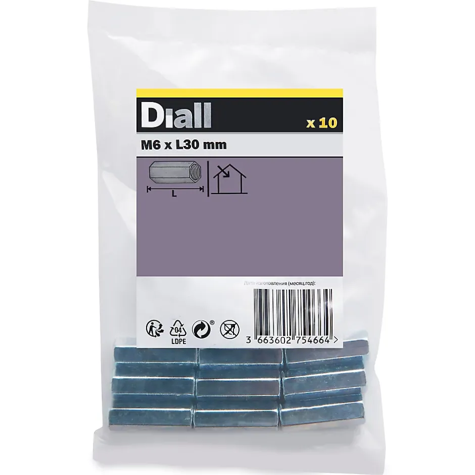 Les 10 écrous de raccordement de tige filetée hexagonale zingués de ce pack sont fabriqués à partir d’acier au carbone. Ils mesurent 30 mm de longueur et ont un diamètre M6. Idéaux pour joindre deux filetages mâles.