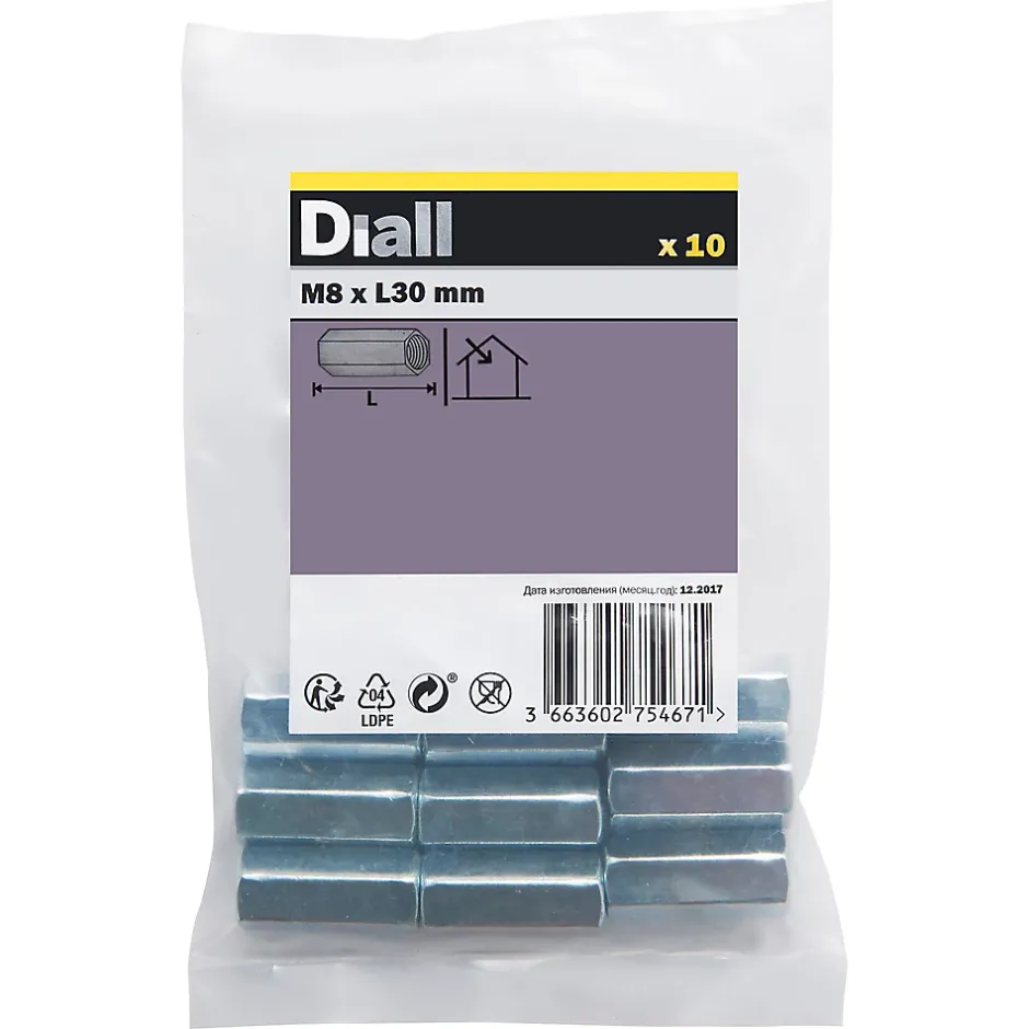 Les 10 écrous de raccordement de tige filetée hexagonale zingués de ce pack sont fabriqués à partir d’acier au carbone. Ils mesurent 30 mm de longueur et ont un diamètre M8. Idéaux pour joindre deux filetages mâles.