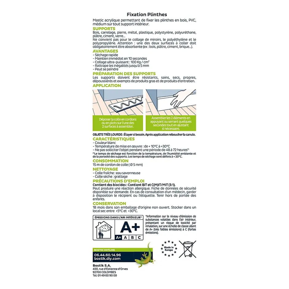 Bostik Fixation Plinthes multi-matériaux est une colle de fixation et d’étanchéité idéale pour les plinthes et autres matériaux.
