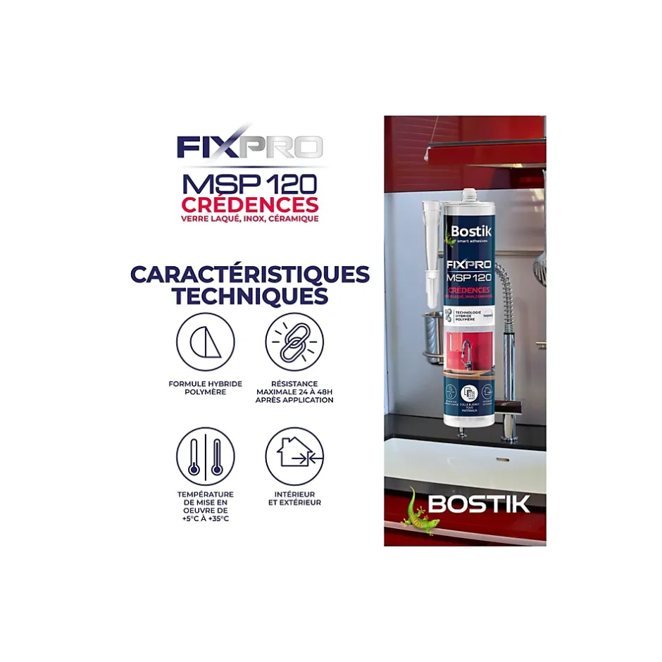 Bostik Fixpro MSP 120 crédences est une colle de fixation et d’étanchéité transparente, idéale pour tous types de crédences.