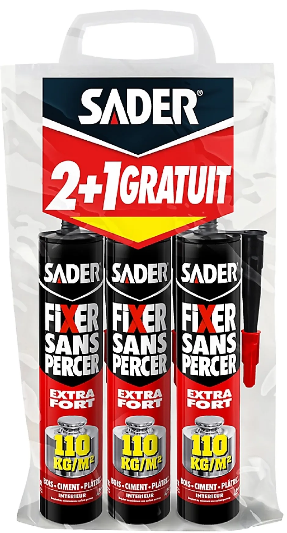 Mastic de Fixation Sader Fixer Sans Percer Extra Fort Lot de 2 Cartouches 310 ml + 1 Gratuite – Intérieur