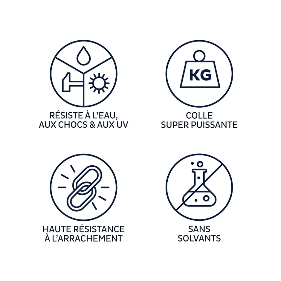 - Colle sur tous supports, même humides (sauf polyéthylène et polypropylène)