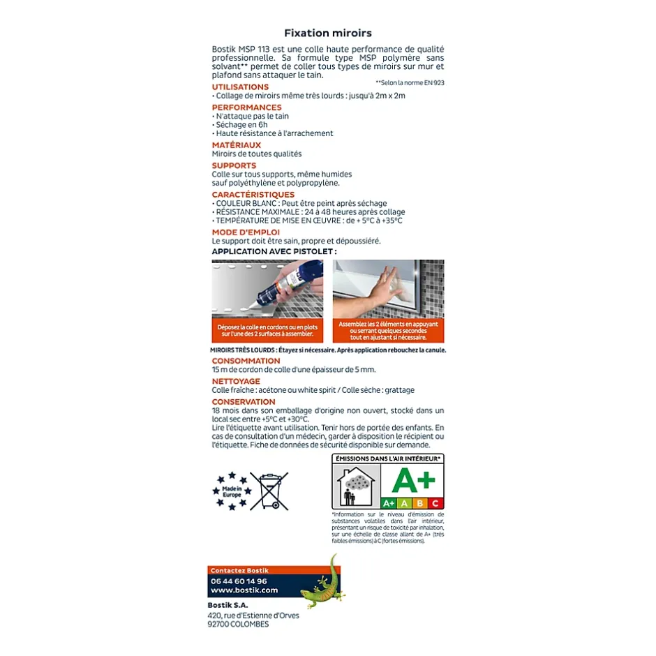 Bostik Fixpro MSP 113 miroirs est une colle professionnelle haute performance pour fixer tous types de miroirs sans attaquer le tain.