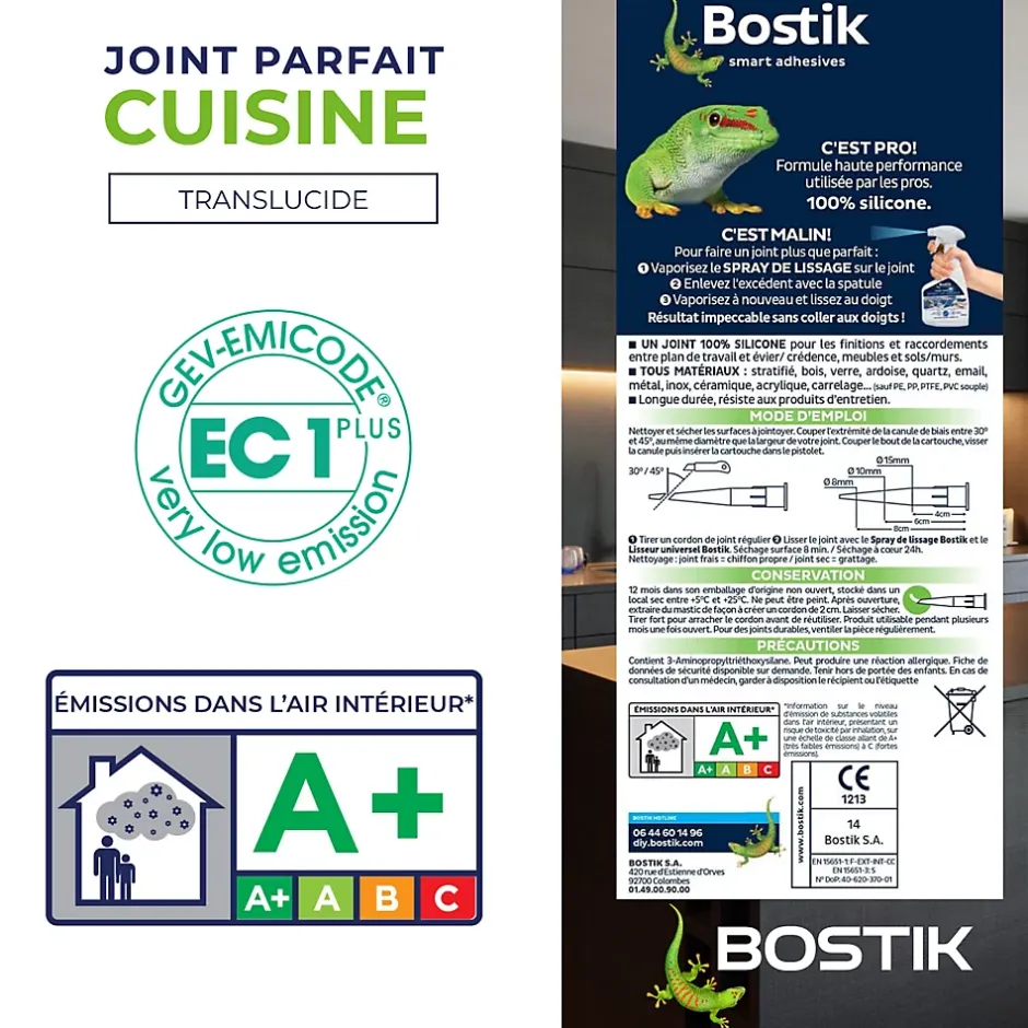 Découvrez Bostik Joint Parfait Cuisine, un mastic silicone professionnel spécialement formulé pour assurer des raccords et finitions d’étanchéité autour des zones sensibles de la cuisine. Utilisable entre un plan de travail et un évier, autour d’une crédence, ou entre meubles et mur, il garantit une protection longue durée contre l’humidité et les salissures. Sa formule 100% silicone, sans odeur et compatible avec les aliments (certification ISEGA), permet une application sûre et propre dans les environnements alimentaires. Grâce à son traitement anti-moisissure, il empêche le développement de champignons, assurant une finition durable même dans les zones exposées à l’eau. Son application est simple avec un pistolet extrudeur, et sa texture ne coule pas, pour un lissage facile et un résultat impeccable. Ce mastic est compatible avec une grande variété de matériaux (stratifié, bois, verre, ardoise, inox, céramique, etc.) à l’exception des supports non adhérents comme le PE, le PP ou le PVC souple. Chaque cartouche de 280ml permet de réaliser environ 15 m de joint (Ø 50mm). Classé A+, il respecte les exigences les plus strictes en matière de qualité de l’air intérieur.