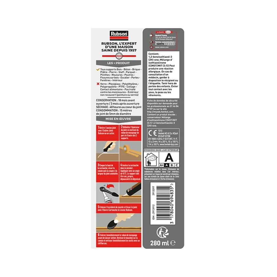 - Conseil d’utilisation : Déposer complètement tous les joints ou résidus existants. Nettoyer soigneusement le joint pour éliminer les contaminants et laisser sécher. Couper le bout de la cartouche au-dessus du filetage. Retirer le capuchon de la buse et couper la buse en diagonale pour s’adapter à la largeur du joint. Visser la buse sur la cartouche. Insérer la cartouche dans un pistolet à cartouche. Tirer sur la gâchette pour appliquer le joint dans le joint. Assurer le bon contact des deux côtés du joint. Lisser le joint à l’aide d’un outil de finition de joint dans les 5 minutes. Retirer l’excédent de joint immédiatement avec de l’eau. Il est recommandé d’utiliser ce produit dans des endroits bien aérés