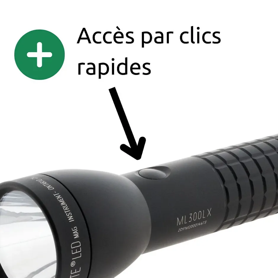 - Système Quick-Click : Permet d’accéder rapidement aux différents modes d’éclairage par un, deux ou trois clics, facilitant le passage entre les configurations pour une utilisation intuitive.