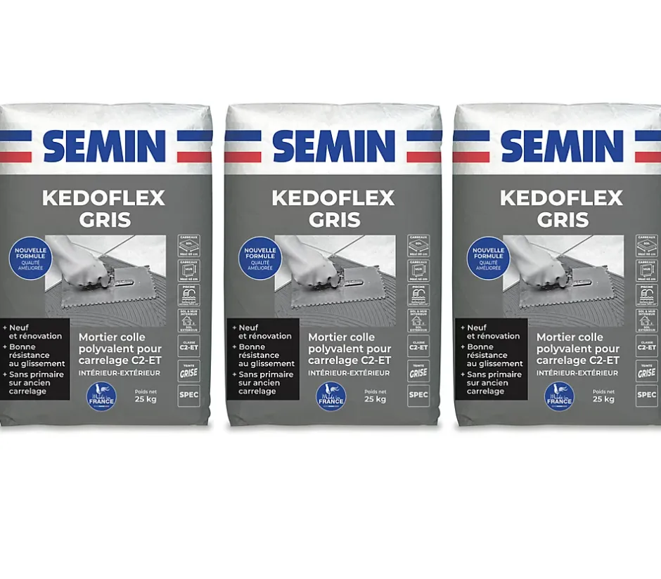 KEDOFLEX est un mortier colle de classe C2 pour la pose de céramiques, terre cuite, pâte de verre, de petits et grands formats, sur murs et sols en intérieur et sols en extérieur. Convient pour les carreaux de faible porosité ainsi que pour la plupart des supports.Ce pack contient :• Colle mortie Kedoflex Gris, 3 sacs de 25 kgCOMPOSITIONCiment gris, sable, résine fortement dosée et divers adjuvants.SUPPORTS ADMISMurs intérieurs :• Béton banché (3600 cm²)• Enduit ciment (3600 cm²)• Enduit au mortier bâtard (3600 cm²)• Plaques de plâtre (3600 cm²)• Béton cellulaire (3600 cm²)• Carreaux de terre cuite (3600 cm²)REVETEMENTS• Grès pressé ou étiré (émaillé ou non)• Terre cuite pressée ou étirée (émaillée ou non)• Faïence• Pâte de verre• Plaquettes de parement• Pierres reconstituées, marbre (utiliser Kedoflex Blanc)STOCKAGE6 mois à l’abri de l’humidité en emballage d’origine non entamé.CONSOMMATIONLa consommation dépend du mode d’encollage et de l’outil d’application.• En simple encollage, 4 kg/m²• En double encollage, 6 kg/m²APPLICATIONVerser dans un récipient propre environ 7,5 à 8 l. d’eau par sac de 25 kg, homogénéiser le tout de préférence avec un malaxeur mécanique et laisser reposer la colle 5 à 10 mn.