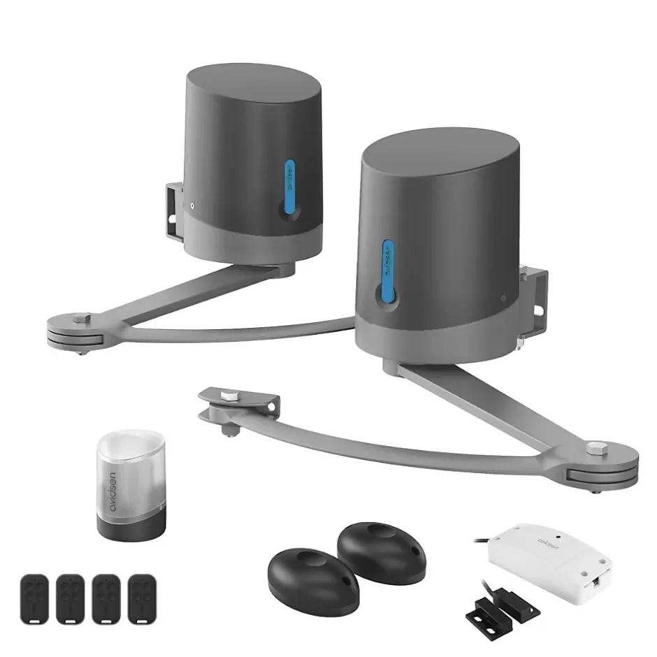 Une motorisation connectée complète pour portail battantLe kit comprend :1 moteur à bras pour portail battant Avidsen Orane SE (ref 114203)2 moteurs à bras articulés 24 VDC avec électronique intégréepattes de fixation incluses1 télécommande à 4 boutons1 feu clignotant1 paire de photocellules pour portail battant (ref 114359)1 kit HomeGate pour connecter un moteur de portail battant (ref 127041)1 module Wifi1 capteur de position avec 5 mètres de câble1 kit de fixation3 télécommandes Avidsen (ref 114258)3 télécommandes3 piles CR2032 Une pérennité renforcée pour plus de sécuritéEn respectant le mouvement naturel du portail, avec le démarrage progressif et le ralenti en fin de course, ainsi que l’arrêt en cas d’obstacle et la marche arrière, le moteur de portail allonge sa durée de vie et votre passage est sécurisé en toutes circonstances. Notez aussi la présence de la fonction auto-apprentissage qui mémorise les paramètres que vous avez choisis à l’installation. Quatre modes d’ouverture à votre dispositionSelon vos besoins, choisissez le mode d’ouverture correspondant. Quatre sont à votre disposition : le mode automatique (après temporisation, avec les photocellul