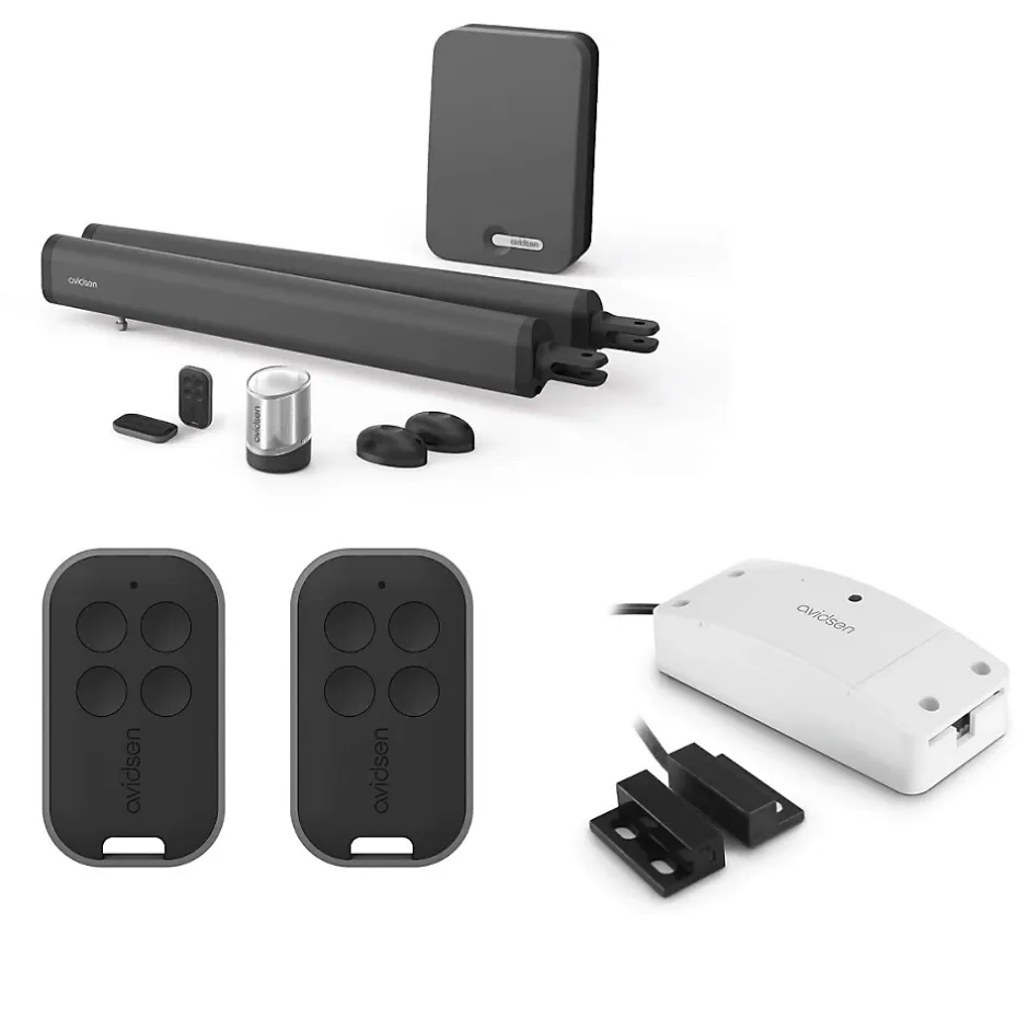 Un kit motorisation connectéeCe kit comprend :1 motorisation à vérins Teha 410 (réf. 114173)2 vérins électroniques avec un système à vis sans fin, pattes de fixation1 paire de photocellules 1 boitier électronique avec programmation simple (ouverture/fermeture)2 télécommandes à 4 boutons chacune, ayant une portée de 80 mètres en champ libre + 2 piles CR2032 (une pour chaque)1 feu clignotant à LED1 module connecté Homegate (réf. 127041)1 module Wifi1 capteur de position avec 5 mètres de câble1 kit de fixation2 télécommandes supplémentaires soit 4 en tout (réf. 114258)2 télécommandes2 piles CR2032 Motoriser son portail pour gagner en temps et en confortAvec un portail motorisé, l’utilisateur gagne du temps. Plus besoin de sortir de son véhicule pour actionner ses battants ; la télécommande fonctionne depuis l’intérieur de la maison, de la voiture. C’est un gain de temps matin et soir, et c’est beaucoup plus confortable également ! Un véritable gain de confortAvec un module qui rend votre moteur connecté, vous gagnez en confort. Plus besoin de sortir de votre véhicule pour ouvrir et fermer le portail/le garage. Vous gagnez du temps en vous épargnant quelques actions matin et soir. Tout se fait d’un simple clic.Le quotidien amélioré avec l’application Avidsen HomeAvec le module relié à l’application Avidsen Home, vous suivez la position de votre portail en temps réel. Vous gardez le contrôle total de vos accès, vous gérez vos visites. Vous organisez en plus des scenarii avec d’autres accessoires d