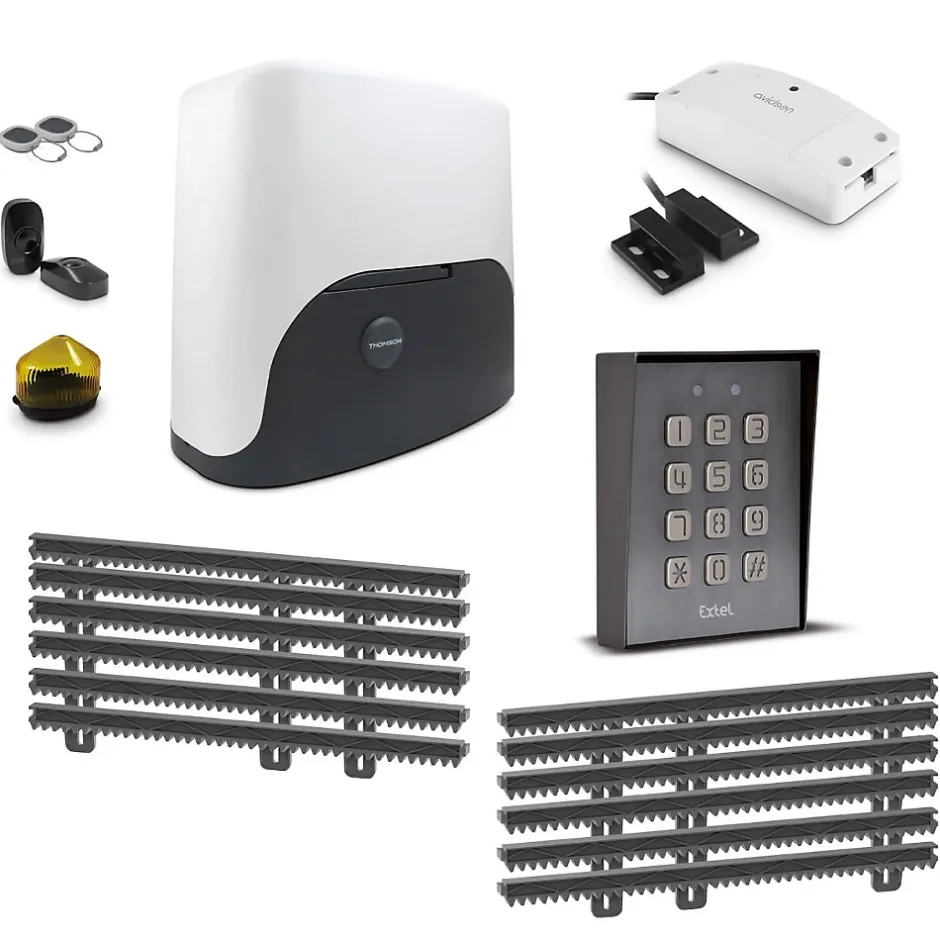 Un kit complet pour votre portail de 6mLe kit comprend :1 motorisation pour portail coulissant Thomson (réf. 500044)Un moteur avec son électronique de commande intégrée ;Deux télécommandes bidirectionnelles ; Un feu clignotant ; Un support de fixation ; Un jeu de photocellules12 crémaillères supplémentaires de 50cm – soit 6m au total (réf. 104452)Crémaillères en nylon renforcéVisserie non fournie1 module connecté HomeGate (réf. 127041)1 module Wifi1 capteur de position avec 5 mètres de câble1 kit de fixation1 digicode filaire Klavy 3 (réf. 109115)1 clavier en métal 1 visière de protection attachée au clavier1 transformateur 12 V Robustesse et pérennitéOptez pour un moteur de portail solide et fait pour durer dans le temps. Il est en effet muni de matériaux résistants aux chocs ou aux intempéries. Notez en plus : Le plastique est choisi pour résister aux rayons UV ; La coque est en aluminium verni. Un véritable gain de confortAvec un module qui rend votre moteur connecté, vous gagnez en confort. Plus besoin de sortir de votre véhicule pour ouvrir et fermer le portail/le garage. Vous gagnez du temps en vous épargnant quelques actions matin et soir. Tout se fait d’un simple clic.Le quotidien amélioré avec l’application Avidsen HomeAvec le module relié à l’application Avidsen Home, vous suivez la position de votre portail en temps réel. Vous gardez le contrôle total de vos ac