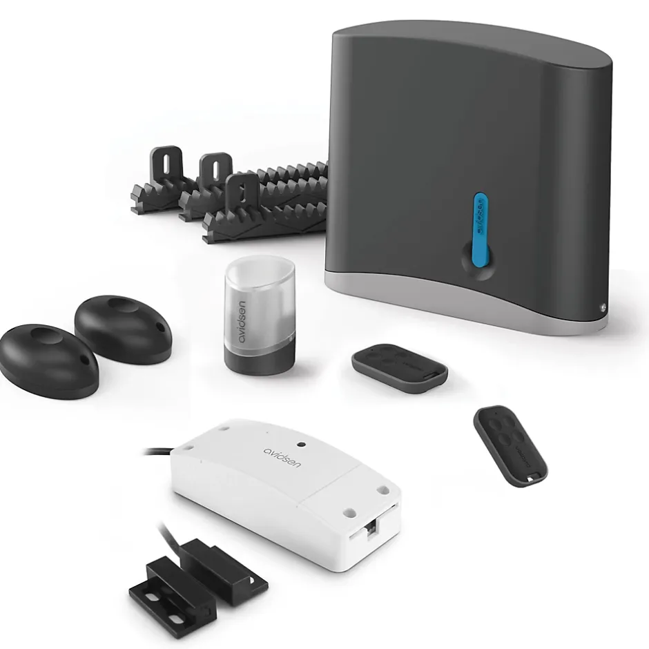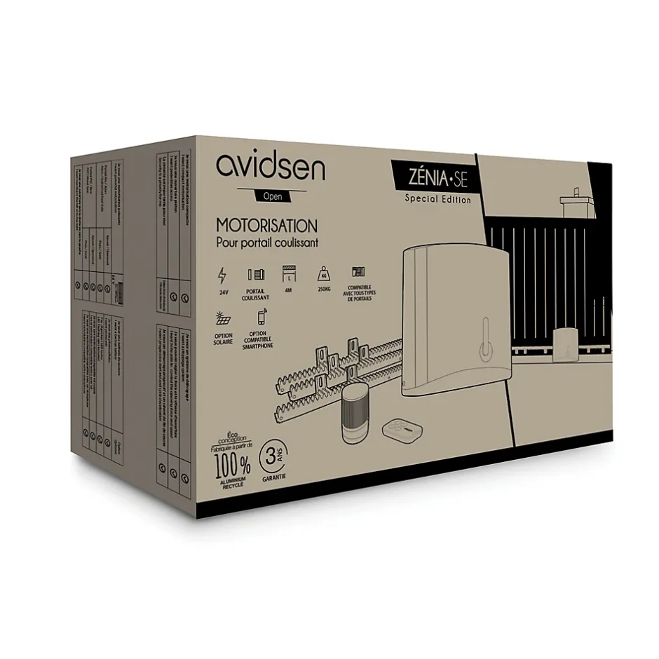 Kit motorisation connectéeCe kit comprend :-1 motorisation coulissante ZENIA SE (Ref : 114462)1 moteur 24 VDC avec électronique intégrée6 crémaillères de 50 cm (soit 3 m de crémaillère au total)1 télécommande à 4 boutons chacune1 feu clignotant LED- 1 kit connecté HomeGate (Ref : 127041)- 1 jeu de photocelule (Ref : 114359)- 1 télécommande supplémentaire – 2 en tout (Ref :114258) Un dispositif pérenneRespect du mouvement naturel du portail, démarrage progressif et ralenti en fin de course, arrêt en cas d’obstacle et marche arrière : les fonctions de Zenia – SE permettent à votre portail motorisé de durer dans le temps. En plus, la crémaillère composée de nylon et d’une barre en acier à l’intérieur est facile à entretenir, ne rouille pas et ne casse pas.Le quotidien amélioré avec l’application Avidsen HomeAvec le module relié à l’application Avidsen Home, vous suivez la position de votre portail en temps réel. Vous gardez le contrôle total de vos accès, vous gérez vos visites. Vous organisez en plus des scenarii avec d’autres accessoires de la gamme Avidsen Home.Un véritable gain de confortAvec un module qui rend votre moteur connecté, vous gagnez en confort. Plus besoin de sortir de votre véhicule pour ouvrir et fermer le portail/le garage. Vous gagnez du temps en vous épargnant quelques actions matin et soir. Tout se fait d’un simple clic.Une