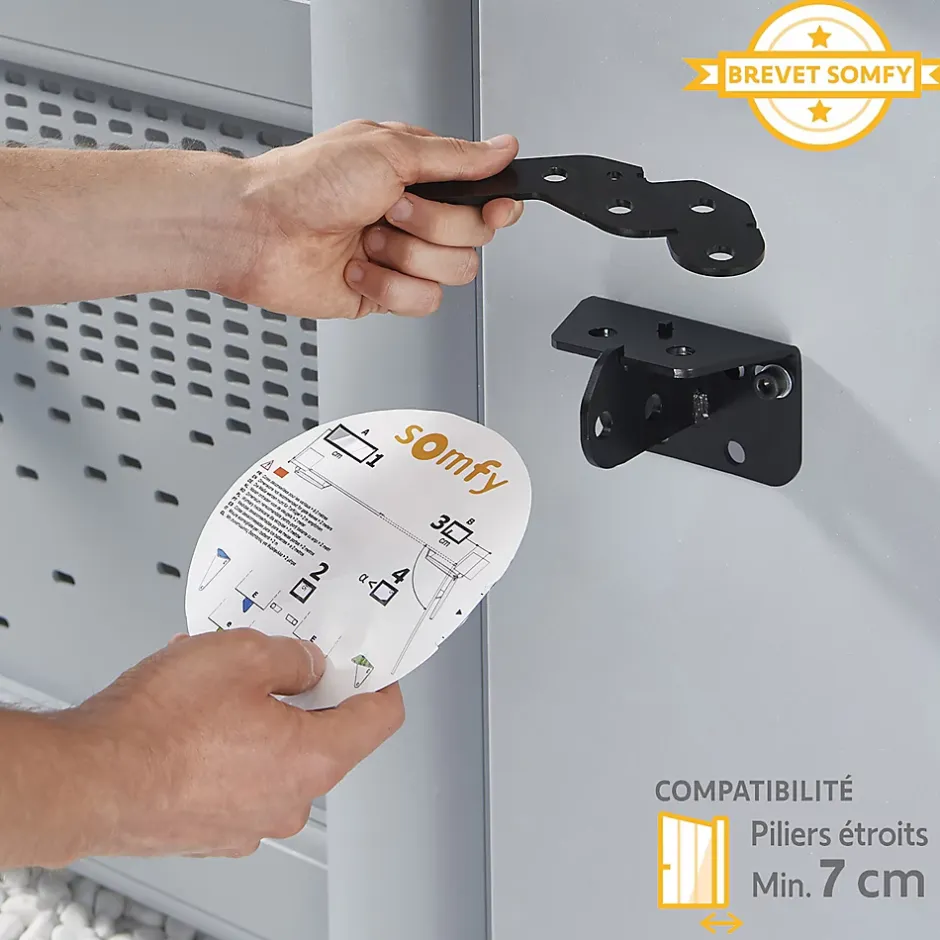 - Nouveauté 2023 : Ce pack inclut des pattes de fixation compatibles avec les piliers étroits jusqu’à minimum 7cm de largeur (ou min 10 cm si les butées mécaniques d’ouverture du moteur sont utilisées).