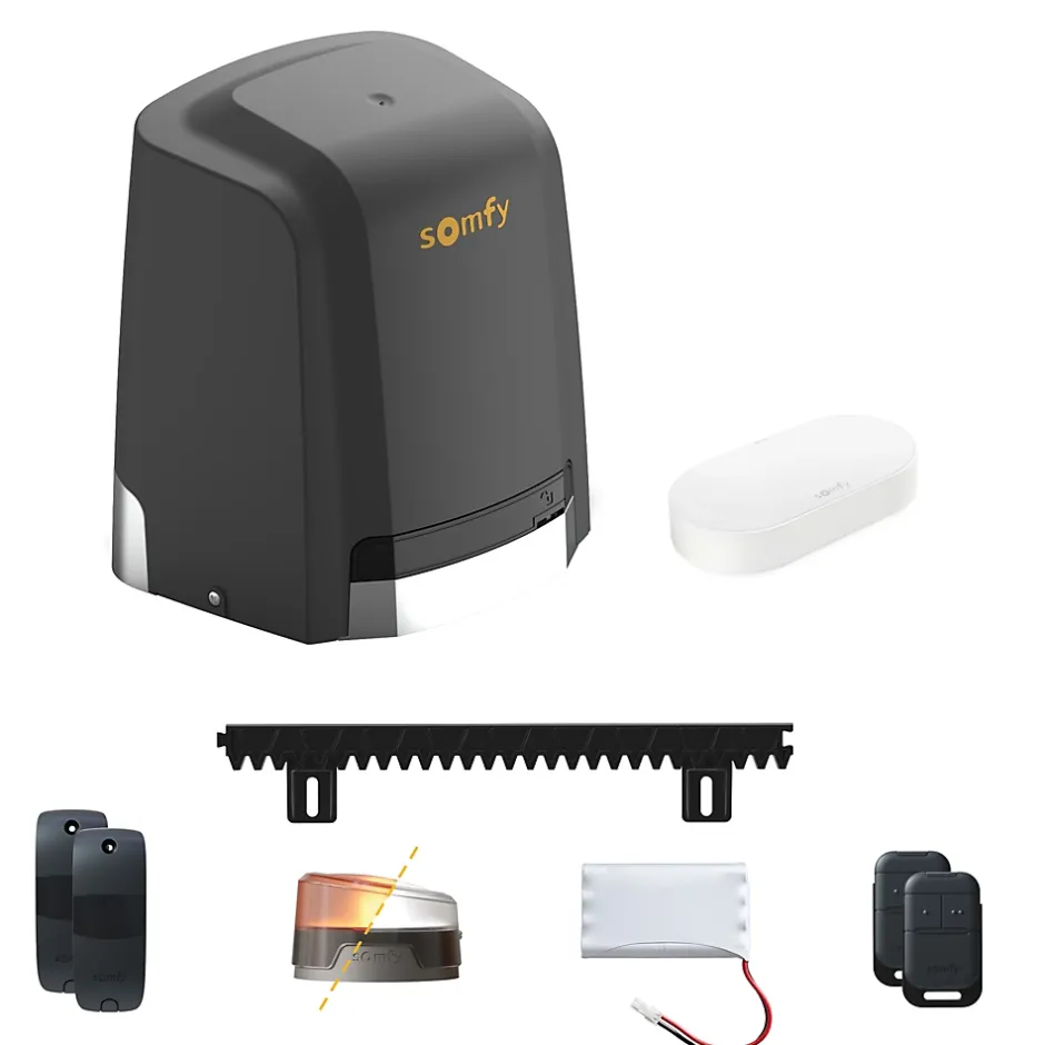 - Kit de motorisation pour portail coulissant incluant 1 moteur, 2 télécommandes 2 touches Keypop, 1 batterie de secours, 4 mètres de crémaillère, 1 feu clignotant, 1 jeu de cellules photoélectriques et 1 kit de connectivité
