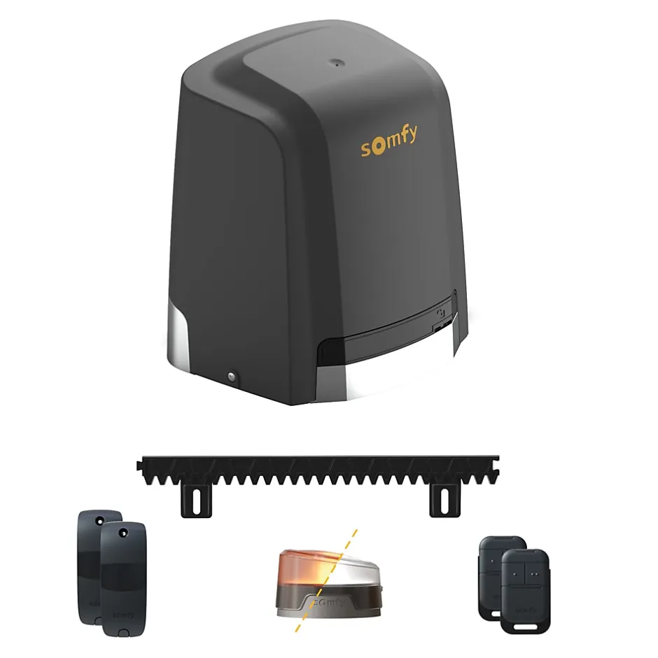 - Kit de motorisation pour portail coulissant incluant 1 moteur Slidymoove (électronique intégrée), 2 télécommandes 2 touches Keypop, 4 mètres de crémaillère, 1 feu clignotant bi-couleur orange ou blanc, 1 jeu de cellules photoélectriques.
