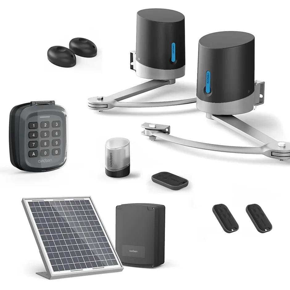 Kit Premium ultra completContenu du kit :1 motorisation Avidsen ORANE SE pour portail battant (Ref : 114203):Deux moteurs à bras articulés (24VDC) avec une électronique intégrée et leurs pattes de fixation inclusesune télécommandes à quatre boutonsUn feu clignotant1 Kit solaire Avidsen (Ref : 114375)1 digicode Avidsen (Ref : 114255)2 Télécommandes supplémentaires – 3 en tout (Ref : 114259)1 paire de photocellules (Ref : 114359) Quatre modes d’ouverture à votre dispositionSelon vos besoins, choisissez le mode d’ouverture correspondant. Quatre sont à votre disposition : le mode automatique (après temporisation, avec les photocellules)le mode semi-automatique (avec la télécommande)le mode piéton (ouverture d’un seul battant)le mode portillon (pour un portail à un seul battant)Un moteur de portail confortableSelon vos besoins, réglez la force, la vitesse et l’accélération de votre moteur de portail. Vous aurez également la possibilité de déverrouiller manuellement le moteu