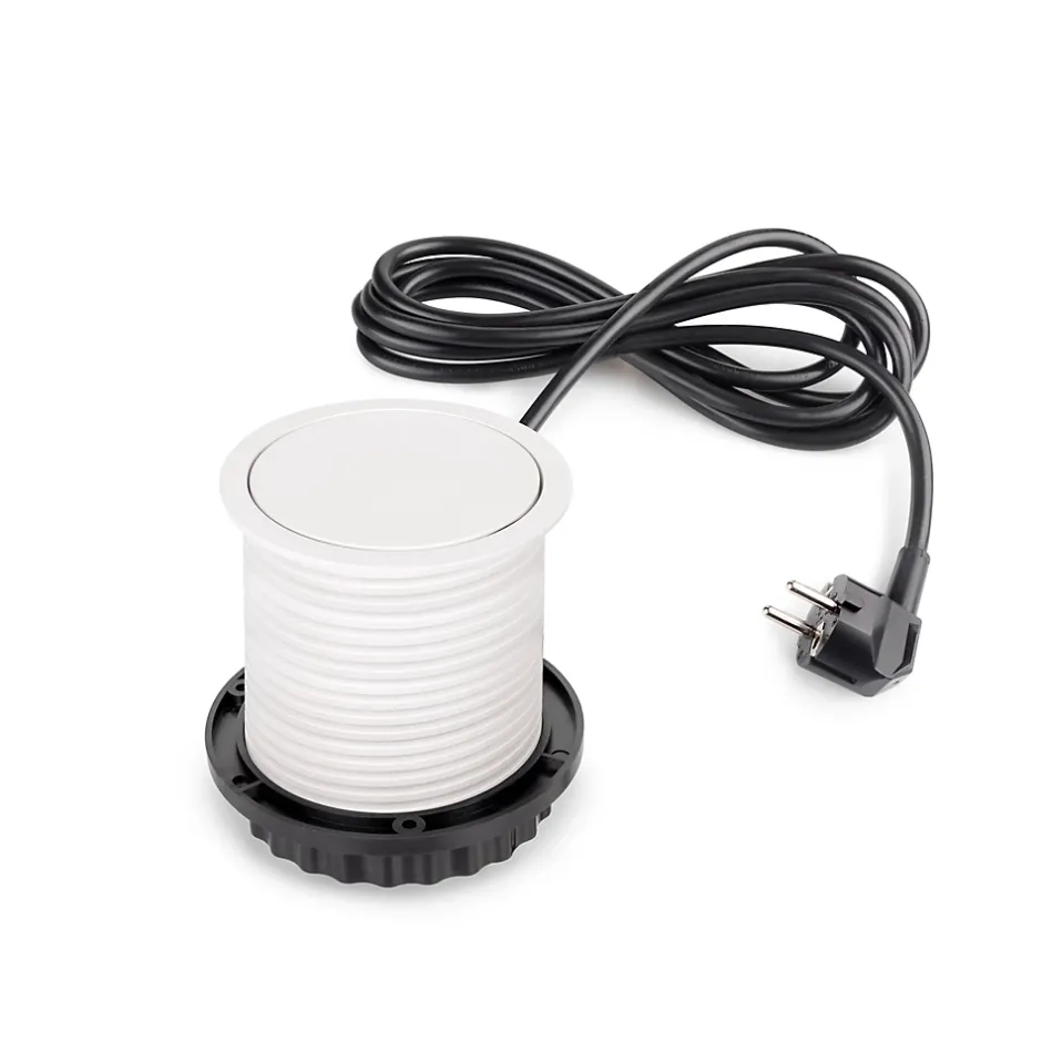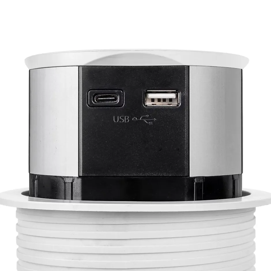 Multi-connecteur à encastrer dans les meubles de cuisine, de bureau et de maison, avec extraction simultanée des connexions par pressage.Il dispose de 3 fiches de type Schuko avec une puissance maximale autorisée allant jusqu’à 3 680 W – 16 A, destinées au marché européen de l’UE.Il dispose d’une connexion USB de type A et d’une connexion USB de type C pour recharger des appareils tels que des smartphones et des tablettes (USB A+C: 5.0V 3.4A (Max. 17.0W), USB A/C: 5.0V 3.4A (Max. 17.0W)).Pour son installation, il nécessite un usinage de 100mm de diamètre sur des surfaces d’épaisseur comprise entre 1 et 70mm, et il se fixe également au meuble sans avoir besoin d’outils grâce à un écrou de fixation manuel.Il est fabriqué en plastique et aluminium en couleur blanc, et dispose d’un câble d’alimentation de 1,5m avec une prise 230 V CA 50 Hz. VOIR LES MESURES DU PRODUIT DANS LES IMAGES. Tour multiprise Vertikal Push 100 conçue pour que les prises de courant et les connecteurs USB intégrés au meuble soient toujours accessibles grâce à sa conception rétractable pour une extraction et une dissimulation manuelles. Les connecteurs sont complètement cachés lorsqu’ils ne sont pas utilisés et se retirent simultanément en appuyant sur le dessus.Cette multiprise dispose de 3 prises de type Schuko (UE), 1 USB type A et 1 USB type C pour recharger des appareils tels que smartphones et tablettes.Son installation est très polyvalente, il ne nécessite qu’un usinage de diamètre 100mm et il peut être monté sur des surfaces très épaisses, entre 1 et 70mm. Il se fixe également au meuble sans avoir besoin d’outils grâce à un écrou de fixation manuel.Il est également fabriqué en plastique et en aluminium, et dispose d’un câble de 1,5m avec une fiche pour un fonctionnement à 230 V AC 50 Hz.