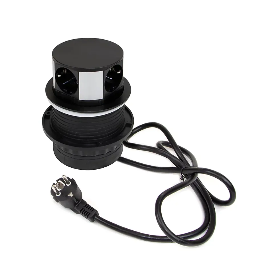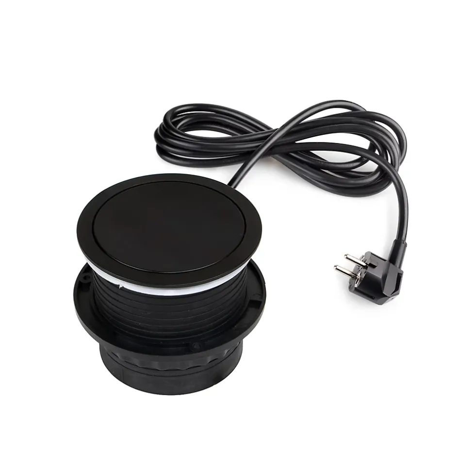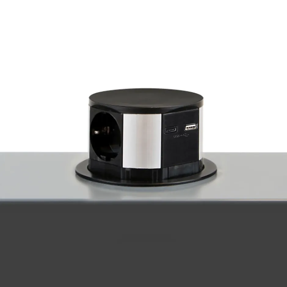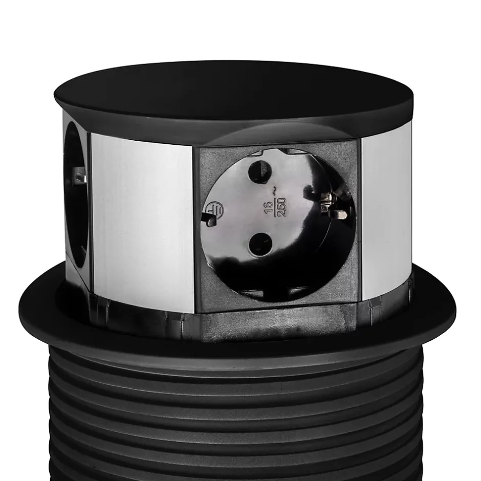 Multi-connecteur à encastrer dans les meubles de cuisine, de bureau et de maison, avec extraction simultanée des connexions par pressage.Il dispose de 3 fiches de type Schuko avec une puissance maximale autorisée allant jusqu’à 3 680 W – 16 A, destinées au marché européen de l’UE.Il dispose d’une connexion USB de type A et d’une connexion USB de type C pour recharger des appareils tels que des smartphones et des tablettes (USB A+C: 5.0V 3.4A (Max. 17.0W), USB A/C: 5.0V 3.4A (Max. 17.0W)).Pour son installation, il nécessite un usinage de 100mm de diamètre sur des surfaces d’épaisseur comprise entre 1 et 70mm, et il se fixe également au meuble sans avoir besoin d’outils grâce à un écrou de fixation manuel.Il est fabriqué en plastique et aluminium en couleur noir, et dispose d’un câble d’alimentation de 1,5m avec une prise 230 V CA 50 Hz. VOIR LES MESURES DU PRODUIT DANS LES IMAGES. Tour multiprise Vertikal Push 100 conçue pour que les prises de courant et les connecteurs USB intégrés au meuble soient toujours accessibles grâce à sa conception rétractable pour une extraction et une dissimulation manuelles. Les connecteurs sont complètement cachés lorsqu’ils ne sont pas utilisés et se retirent simultanément en appuyant sur le dessus.Cette multiprise dispose de 3 prises de type Schuko (UE), 1 USB type A et 1 USB type C pour recharger des appareils tels que smartphones et tablettes.Son installation est très polyvalente, il ne nécessite qu’un usinage de diamètre 100mm et il peut être monté sur des surfaces très épaisses, entre 1 et 70mm. Il se fixe également au meuble sans avoir besoin d’outils grâce à un écrou de fixation manuel.Il est également fabriqué en plastique et en aluminium, et dispose d’un câble de 1,5m avec une fiche pour un fonctionnement à 230 V AC 50 Hz.