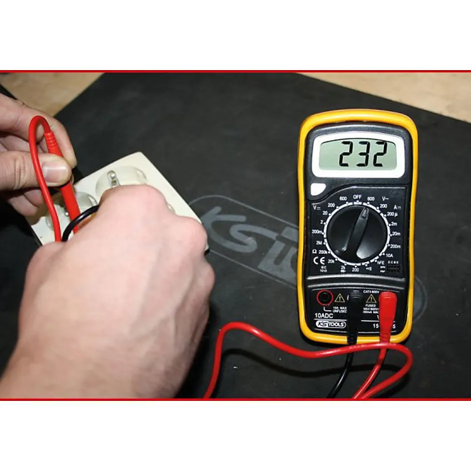 Multimètre compact avec écran LCD 3½, fonctions essentielles (tension continue et alternative, courant continu, résistance), tests diode et transistor, test de continuité sonore, fonction HOLD et pointes d’essai incluses pour des mesures rapides et fiables.