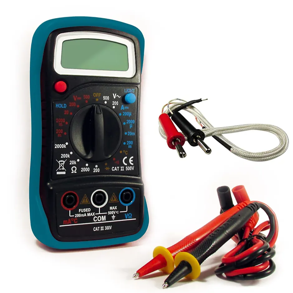 Six fonctions de mesure disponiblesla tension AC/CCl’intensité du courant CCla résistancele test de diodesle test de continuitéla température Ce multimètre numérique Avidsen est un outil indispensable de mesure électrique, utile lorsque vous faites des travaux, que ce soit chez vous, dans un laboratoire ou dans un atelier. Facilement transportable, ce multimètre numérique propose six fonctions différentes : la tension AC/CCl’intensité du courant CCla résistancele test de diodesle test de continuitéla températurePour effectuer les mesures, utilisez les deux sondes isolées ou utilisez la sonde de température. Dans tous les cas, à la lecture, vous aurez un affichage numérique à 3.5 chiffres. L’affichage est maximal à 1999 avec 3,5 mises à jour par seconde.Caractéristiquestension maximale entre borne et mise en terre : 500 V CC/CAtolérance thermique : 0° à 40° en fonction, -10° à 50° stockétolérance à l’altitude : 2000 mètres en fonction, 10 000 mètres stockésécurisé : protégé contre les surchauffes grâce à une double isolationfonctionne sur piles : 2 x AAA (fournies), alerte batterie faible qui s’af