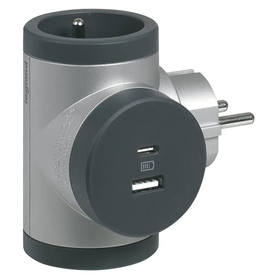 Multiprise 2 prises + 1 x USB-A + 1 x USB-C rotative Legrand aluminium et gris