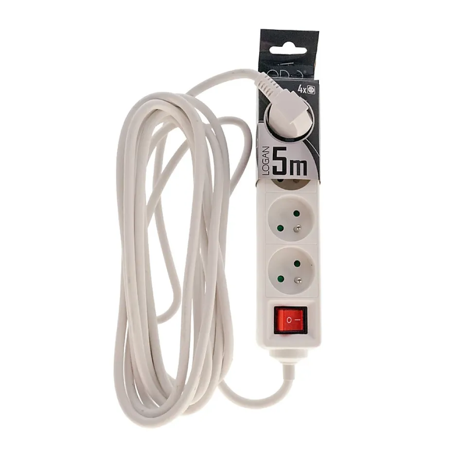 Rallonge domestique portable LOGAN White 4 prises avec mise à la terre 5m avec interrupteur EDO777670DONNÉES GÉNÉRALES ✔️ Utilisation : intérieur ✔️ Couleur : blanc ✔️ Type de prise : E (avec broche de terre) ✔️ Nombre de prises : 4 ✔️ Interrupteur : oui ✔️ Protection enfant : oui ✔️ Type de fiche : F (Schuko) ✔️ Matériau de la fiche : PVC ✔️ Longueur du câble [m] : 5 m ✔️ Section du câble [mm²] : 1,5 mm² ✔️ Type de câble : H05VV-F ✔️ Mise à la terre : oui ✔️ Matériau d’isolation : plastique PP ✔️ Classe de résistance au feu de l’isolation : V-0 ✔️ Matériau du boîtier : plastique PP ✔️ Tension nominale [V] : 230 V ✔️ Courant nominal [A] : 16 A ✔️ Charge maximale [W] : 3680 W ✔️ Fréquence [Hz] : 50 Hz ✔️ Indice de protection : IP20 ✔️ Classe de protection : I ✔️ Conditions ambiantes [°C] : -5…35℃ ✔️ Poids [g] : 694 gDimensions du boîtier [mm] ✔️ 240 x 54 x 38 mm