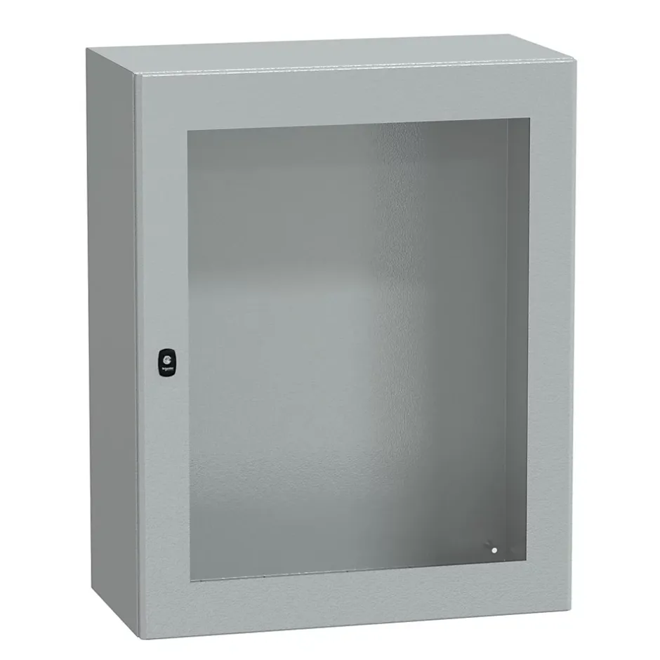 Coffret acier laminé – HxLxP : 1000 x 800 x 400mm – avec plaque passe-câblesCe coffret métal est étanche IP66, c’est-à-dire qu’il résiste aux jets d’eau puissants. Cette armoire électrique très robuste résiste aux chocs IK08 .Ce coffret métallique étanche est issu de la gamme Spacial S3D. Il est livré avec avec une plaque passe-câbles à percer pour y intégrer des presses étoupes. Il est également possible d’installer une plaque passe-câbles avec entrée souple sans perçage disponible en accessoireL’armoire NSYS3D10840T est équipée de 1 porte vitrée verrouillée par 1 serrure avec fermeture 3 points à empreinte double panneton. Possibilité de remplacer par serrure à clé, disponible en optionLes points clés du coffret S3D Schneider NSYS3D10840TPattes de fixation NSYAEFPFSC à commander séparémentPlaque de montage en optionBarrette de terre disponible en accessoireMontage : mural; sur poteau; sur pied; sur socle