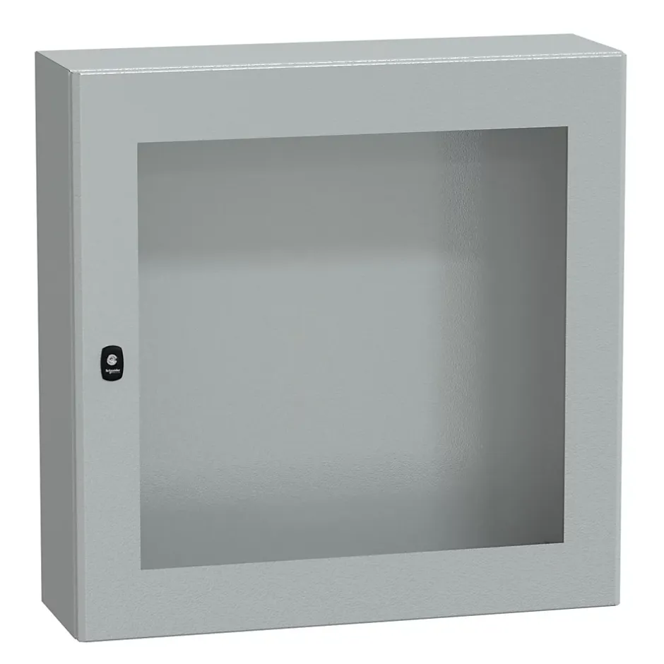 Coffret acier laminé – HxLxP : 800 x 800 x 250mm – avec plaque passe-câblesCe coffret métal est étanche IP66, c’est-à-dire qu’il résiste aux jets d’eau puissants. Cette armoire électrique très robuste résiste aux chocs IK08 .Ce coffret métallique étanche est issu de la gamme Spacial S3D. Il est livré avec avec une plaque passe-câbles à percer pour y intégrer des presses étoupes. Il est également possible d’installer une plaque passe-câbles avec entrée souple sans perçage disponible en accessoireL’armoire NSYS3D8825T est équipée de 1 porte vitrée verrouillée par 1 serrure avec fermeture 3 points à empreinte double panneton. Possibilité de remplacer par serrure à clé, disponible en optionLes points clés du coffret S3D Schneider NSYS3D8825TPattes de fixation NSYAEFPFSC à commander séparémentPlaque de montage en optionBarrette de terre disponible en accessoireMontage : mural; sur poteau; sur pied; sur socle