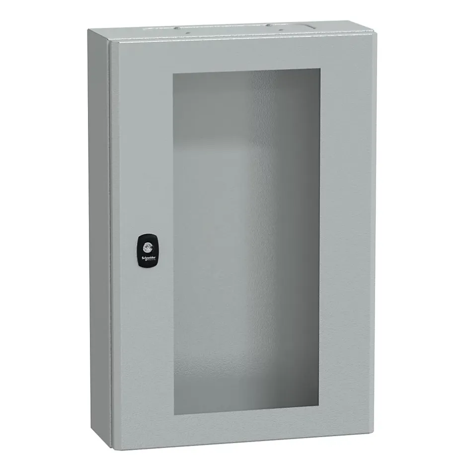 Coffret acier laminé – HxLxP : 600 x 400 x 150mm – avec plaque passe-câblesCe coffret métal est étanche IP66, c’est-à-dire qu’il résiste aux jets d’eau puissants. Cette armoire électrique très robuste résiste aux chocs IK08 .Ce coffret métallique étanche est issu de la gamme Spacial S3D. Il est livré avec avec une plaque passe-câbles à percer pour y intégrer des presses étoupes. Il est également possible d’installer une plaque passe-câbles avec entrée souple sans perçage disponible en accessoireL’armoire NSYS3DM6415T est équipée de 1 porte vitrée verrouillée par 1 serrure avec fermeture 3 points à empreinte double panneton. Possibilité de remplacer par serrure à clé, disponible en optionLes points clés du coffret S3D Schneider NSYS3DM6415TPattes de fixation NSYAEFPFSC à commander séparémentPlaque de montage en optionBarrette de terre disponible en accessoireMontage : mural; sur poteau; sur pied; sur socle