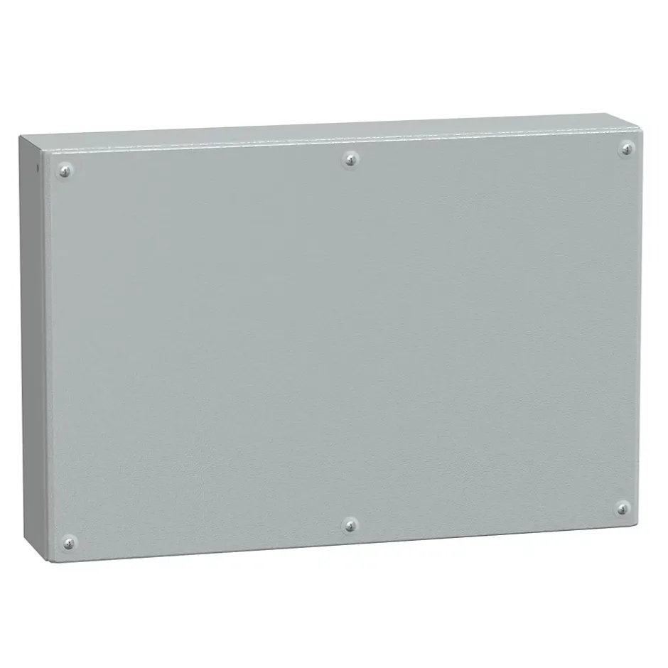 Boitier industriel étanche 400x600x120mm – bords lissesCette boite acier destiné à un usage industriel appartient à la gamme Spacial SBM fabriquée par Schneider.Ce boitier industriel en acier dispose d’un certificat d’étanchéité IP66. Cette étanchéité est renforcée par un joint en polyuréthane.Cette boite est également extrêmement résistante et dispose d’une capacité de résistance aux impacts externe IK10.Équipé d’un capot plein, il est verrouillé au corps de boite par 6 vis.Les bords de la boite ne sont pas prédécoupés, prévoir des presses étoupes pour le passage de câbles.Cette boite peut intégrer une plaque de montage (référence : NSYMM46SB).
