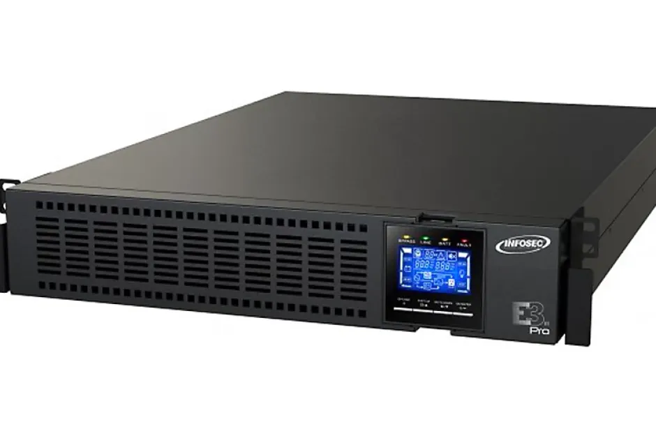 Onduleur INFOSEC E3 PRO RT 1000 VAUne protection performanteEquipée de la technologie On Line Double Conversion contrôlée par micro-processeur, la gamme des onduleurs E3 Pro procure une protection totale et un courant sinusoïdal parfait à vos réseaux et charges en général. En cas de coupure d’électricité, jusqu’à 30 minutes d’autonomie assurent la continuité de service et permettent la sauvegarde de données sensibles. Un connecteur de batterie externe permet l’adjonction d’armoires batteries dédiées à l’extension d’autonomie en fonction des besoins et des contextes (avec affichage de l’état des batteries sur l’écran de l’onduleur).Extension d’autonomieGrâce à son puissant chargeur de batterie intégré (de 1A à 6A selon les modèles), il est tout à fait possible d’additionner le nombre d’armoire batteries nécessaires pour assurer une longue autonomie.Un format idéalLa gamme E3 Pro est composée de 2 versions conçues pour une installation simple : E3 Pro RM 1000 VA est un onduleur au format rack 1U qui peut être facilement intégré dans une baie serveur 19 E3 Pro RT de 1000 à 10k VA est une gamme d’onduleurs polyvalents conçus pour une intégration aisée dans une grande diversité d’environnements : à l’horizontale, dans une baie de brassage grâce aux équerres de fixation (incluses), ou à la verticale en position «tour» grâce à son socle (inclus).