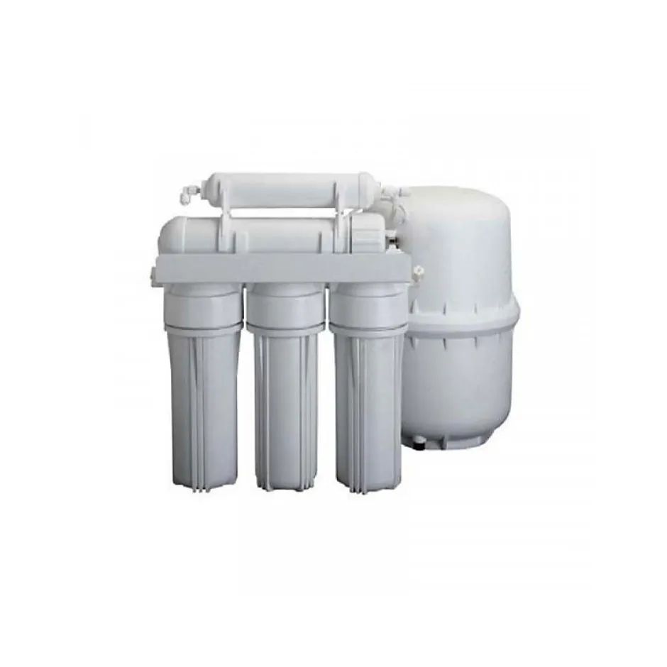 Osmoseur 5 étapes Proline avec pompeSystème complet de traitement de l’eau du robinet.Elimine les sels minéraux, les mauvais goûts et odeurs, les pesticides, herbicides, virus et polluants chimiques.Version pompe booster conseillée pour les pressions de service Comprendspompe,réservoir (pour le stockage d’eau qui a été purifiée),cartouches,membrane 50 GPD,robinet,accessoires de connexion,guide d’installation.Caractéristiques :Alimentation électrique : 445Nettoyage de la membrane : ManuelNombre et capacité de la membrane d’osmose inverse : 1 membrane – 50 GPDCapacité de stockage du ballon : 16L (l 280 mm x H 420 mm)Temps de remplissage : 2 heuresDimensions : H 540mm x L 440mm x P 330mmPression d’arrivée d’eau admissible : 2,5 – 6 barsTempérature d’eau admissible : 2 – 40°CTDS d’entrée maximum : 2000 ppmÉlimination des TDS : 95% (+/- 1,5%)Dureté de l’eau maximum : 25° françaispH admissible : 4 – 11Production d’eau maximum : 175 litres / jour