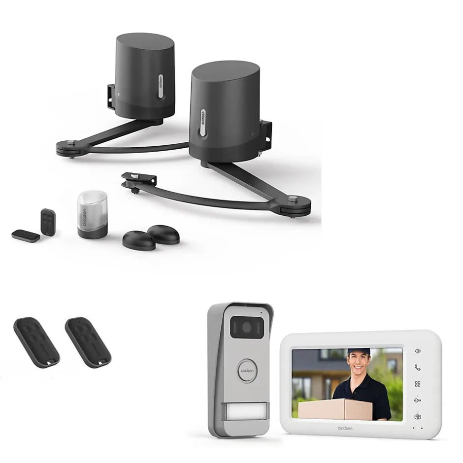 Un kit 100% connecté pour gérer votre portail et accueillir vos invités grâce au visiophoneCe kit complet comprend :1 motorisation à bras Avidsen Orane Connect (réf. 114202)2 moteurs à bras articulés 24 VDC à électronique intégrée2 télécommandes à 4 boutons chacune1 feu clignotant 1 jeu de photocellulesPattes et équerres de fixation 1 module connecté Avidsen Home Gate avec capteur de position, précâbléUn visiophone connecté Elia Smart (réf. 112302)1 moniteur couleur 7 »1 platine de rue1 alimentation secteur1 fixation murale pour le moniteurvisserie de fixation2 télécommandes supplémentaires soit 4 en tout (réf. 114258)Pile CR2032 fournie et intégrée Ouverture vers l’intérieur ou vers l’extérieur de mon entréeOrane Connect offre une ouverture maximale de 135° à l’intérieur de la propriété et une ouverture maximale de 90° à l’extérieur de la propriété. Contrôlez l’accès à votre domicile depuis votre smartphoneGrâce au module connecté, prenez la main sur votre portail à domicile ou à distance via votre smartphone et l’application Avidsen Home. Vous êtes informé en temps réel de la position de vos battants, quel que soit l’endroit où vous vous trouvez. Les avantages d’un visiophone connectéAvec l’application Avidsen Home, votre smartphone devient un écran de visiophone à part entière. Vous visualisez le visiteur quand il sonne, vous ouvrez votre portail et/ou votre portillon depuis votre téléphone, de chez vous ou à distance. Vous gagnez e
