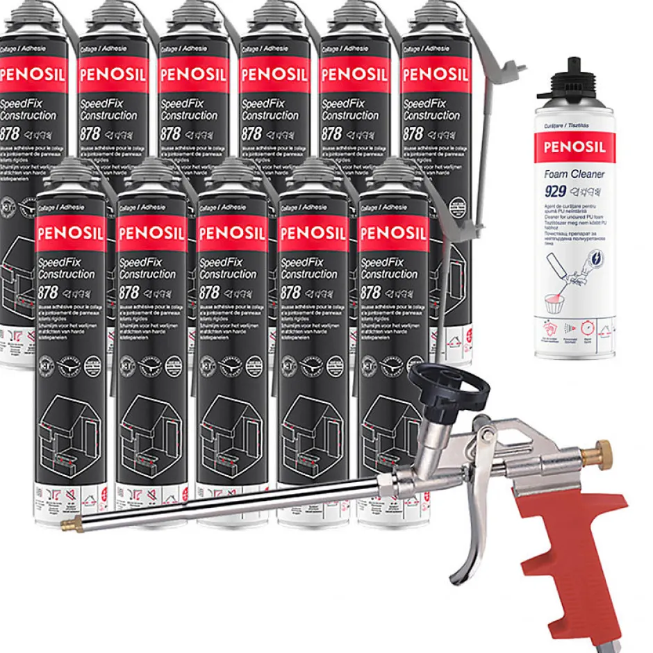 Pack contentant :- 11 Mousses colle universelle SpeedFix Construction 878 pistolable 690ml PENOSIL- 1 Nettoyant mousse polyuréthane Foam Cleaner 929 pistolable 500ml PENOSIL- 1 Pistolet manuel pour mousse expansive ○ Mousses colle universelle SpeedFix Construction 878 pistolable 690ml PENOSIL Mousse colle universelle pour divers travaux de construction à l’intérieur et à l’extérieur. Utilisable en toutes saisons, elle garantit de bons résultats à des températures allant de -5°C à +30°C. La mousse colle possède d’excellentes propriétés de collage et d’isolation thermique, une faible pression de séchage et une faible post-expansion.- Excellentes propriétés de collage.- Convient à une utilisation en toute saison, de -5°C à +30°C.- Faible pression au séchage et faible post-expansion.- Pour l’isolation thermique et acoustique.- Remplissage et isolation des joints étroits.- Isolation thermique 0,034 W/m·K- Empêche les ponts thermiques- Isolation phonique 62dBDomaines d’application :- Fixation de panneaux d’isolation sur les façades et les fondations.- Fixation de panneaux d’aménagement intérieur.- Fixation d’appuis de fenêtre.- Collage de blocs de construction rectifiés.- Réduction de l’impact des ponts thermiquesAdhère sur :○ Polystyrène○ Plaques de plâtre○ Panneaux OSB○ Panneaux agglomérés○ Bois○ Béton○ Pierre○ Métal○ PVC○ Couleur : Gris○ Aérosol pistolable de 690ml△ N’adhère pas aux surfaces en téflon, en polyéthylène et en silicone. Une fois durcie, sensible aux UV et à la lumière directe du soleil et doit donc être recouverte d’un matériau opaque approprié. *Information sur le niveau d’émission de substances volatiles dans l’air intérieur; présentant un risque de toxicité par inhalation, sur une échelle de classe allant de A+