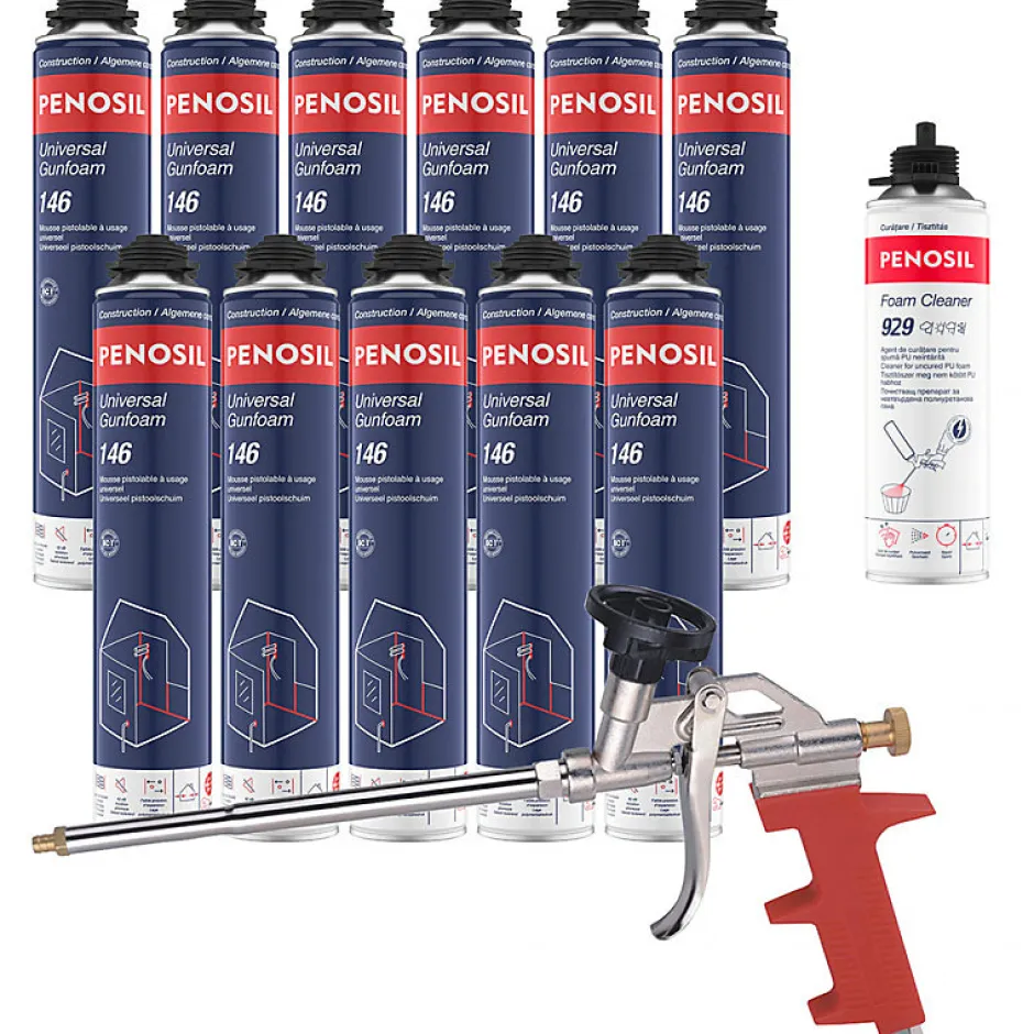Pack contentant :- 11 Mousses polyuréthanes Universal Gunfoam 146 pistolable 690ml PENOSIL- 1 Nettoyant mousse polyuréthane Foam Cleaner 929 pistolable 500ml PENOSIL- 1 Pistolet manuel pour mousse expansive ○ Mousses polyuréthanes Universal Gunfoam 146 pistolable 690ml PENOSIL Mousse universelle de polyuréthane monocomposante prête à l’emploi pour diverses applications dans le bâtiment, par exemple le remplissage et l’étanchéité des joints et des pénétrations, l’isolation thermique et acoustique. Adhère bien à la plupart des matériaux comme le bois, le béton, la pierre, le plâtre, le métal, le PVC et le polystyrène.- Bonnes propriétés de remplissage- Pas de retrait- Faible pression de durcissement- Coefficient d’isolation thermique et acoustique élevéDomaines d’application :- Remplissage des cavités et des interstices- Isolation des pénétrations- Étanchéité et remplissage des joints et cavités- Réduction de l’impact des ponts thermiques- Isolation thermique et acoustique○ Couleur : Beige○ Aérosol pistolable de 690ml△ N’adhère pas aux surfaces en polyéthylène (PE), PTFE (Teflon) ou silicone. *Information sur le niveau d’émission de substances volatiles dans l’air intérieur; présentant un risque de toxicité par inhalation, sur une échelle de classe allant de A+ (très faibles émissions) à C (fortes émissions) → A+ : Très faibles émissions ○ Nettoyant mousse polyuréthane Foam Cleaner 929 pistolable 500ml PENOSIL Nettoyant en spray pour l’élimination de la mousse PU non durcie sur les outils et les surfaces.- Effet immédiat- Nettoyage efficace- Utilisation avec le bouchon de pulvérisation ou un pistolet mousse PUDomaines d’application :- Nettoyage de l’intérieur et de l’extérieur du pistolet mousse après utilisation<