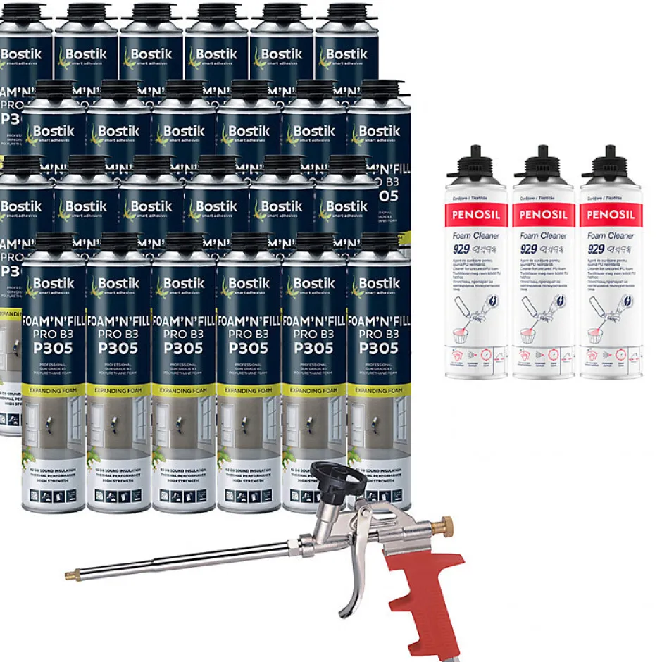 Pack contentant :- 24 Mousses expansives PU pistolable P305 Foam’n’Fill Pro B3 750ml- 3 Nettoyants mousse polyuréthane Foam Cleaner 929 pistolable 500ml PENOSIL- 1 Pistolet manuel pour mousse expansive ○ Mousses expansives PU pistolable P305 Foam’n’Fill Pro B3 750ml BOSTIK – Excellente isolation phonique et thermique- Certifié EC1 Plus et norme A+• Spécialement conçu pour le remplissage de cavités, les joints de plafond et de plancher et les traversées de canalisations de tout type (tuyaux d’eau, eau usés) dans les murs et les sols.• Excellente adhérence sur béton, pierre, plâtre, bois, métal et de nombreux plastiques comme le polystyrène expansé (EPS) et extrudé (XPS), mousse PU rigide et PVC. ○ Nettoyant mousse polyuréthane Foam Cleaner 929 pistolable 500ml PENOSIL Nettoyant en spray pour l’élimination de la mousse PU non durcie sur les outils et les surfaces.- Effet immédiat- Nettoyage efficace- Utilisation avec le bouchon de pulvérisation ou un pistolet mousse PUDomaines d’application :- Nettoyage de l’intérieur et de l’extérieur du pistolet mousse après utilisation- Nettoyage des vêtements et des outils de la mousse de construction non durcie- Nettoyage des cadres de fenêtres, des appuis de fenêtres, des portes, des montants, etc. tant que la mousse PU n’est pas durcie pendant les travauxSecouez vigoureusement la bombe pendant au moins 5 à 10 secondes. Retirer le bouchon en plastique de la bombe et fixer le bouchon du vaporisateur. Vaporiser l’agent nettoyant sur la mousse non durcie, laisser agir et essuyer si nécessaire. Lorsque vous nettoyez un pistolet pour mousse, nettoyez d’abord la surface du pistolet. Ensuite, vissez fermement le pistolet sur l’aérosol, vaporisez du produit de nettoyage pour en nettoyer l’intérieur. Attendre quelques minutes et vaporisez à nouveau pour terminer le p