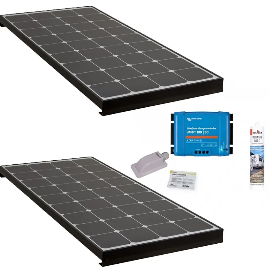 Ce pack comprend:- 2x ANTARION BLACK BOOSTER 170W Seul Panneau solaire Ultra Performant Camping Car- 1x Pack Kit de pose solaire avec Régulateur de Charge VICTRON MPPT 440W 30ADescription Panneau Solaire:PANNEAU SOLAIRE BLACK BOOSTER 170WPanneau solaire ultra performant équipé de cellules SUNPOWER, la technologie de production solaire la plus efficace du marché.Ces cellules très haut de gamme permettent d’obtenir un rendement jusqu’à 35% supérieur par rapport à un panneau classiqueDe plus, ces cellules ont une longévité inégalable avec une durée de vie allant jusqu’à 25 ans sans perte de puissance !Gamme de panneaux solaires avec cellules SUNPOWERPanneau livré seulPattes de fixation en aluminium anodisé striées pour améliorer l’adhérence du panneau lors du collage sur le toitBoitier de connexion étanche pour un haut niveau de sécuritéDiodes de dérivation haute performance pour minimiser les chutes de puissance en cas de faible ensoleillementProtection en verre trempé spécialement conçu pour résister aux intempériesMontage en série ou en parallèle possible et illimitéDimensions : 146.5 x 54 x 6 cmPoids : 14 kgDimensions du câble: 5mDescription Régulateur:Le kit de pose en blister contient :Le régulateur solaire MPPT30A Victron EnergyUn passe-toit étancheUne cartouche Dekasyl MS1Une lingette Dekaclean Caractéristiques du régulateur :Régulateur MPPT 30A VICTRONTension de sortie calculée automatiquement pour respecter les courbes de charge de la batterie. Convient pour toute