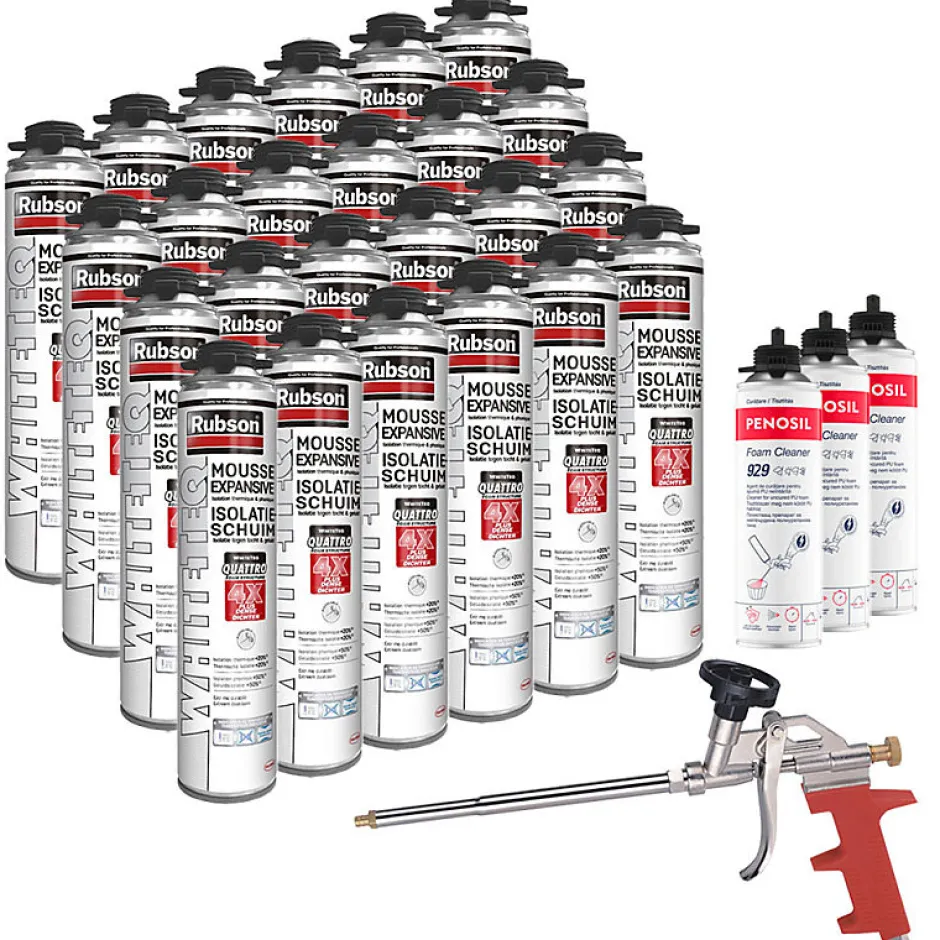 Pack professionnel mousse expansive – 24 aérosols + 3 nettoyants + pistolet Que contient ce pack mousse expansive professionnel ? Ce pack complet pour professionnels et bricoleurs exigeants est conçu pour les travaux d’isolation, de calfeutrage et d’étanchéité. Il regroupe tout le nécessaire pour une application efficace, propre et durable. • 24 mousses expansives RUBSON WhiteTeq pistolables – 750 ml • 3 nettoyants mousse PU Penosil Foam Cleaner 929 – 500 ml • 1 pistolet manuel Fischer Darex pour mousse expansive Pourquoi choisir la mousse expansive RUBSON WhiteTeq ? La mousse expansive WhiteTeq est un isolant polyuréthane haute performance destiné à l’isolation thermique et phonique. Sa technologie de polymères blancs offre une structure dense et homogène, idéale pour une isolation durable. • Isolation thermique améliorée (+20%)• Isolation phonique renforcée (+50%)• Structure dense avec 4 fois plus de cellules/cm³• Résistance aux UV jusqu’à 10 fois supérieure• Haute capacité d’expansion jusqu’à 33 litres À quoi sert le nettoyant mousse PU Penosil Foam Cleaner 929 ? Le Penosil Foam Cleaner 929 est spécialement conçu pour le nettoyage rapide et efficace de la mousse polyuréthane non durcie . Il permet l’entretien des pistolets PU et l’élimination des résidus frais sur outils et surfaces. • Action immédiate et nettoyage en profondeur• Utilisable en spray ou directement pistolable• Nettoyage intérieur et extérieur du pistolet mousse• Idéal pour cadres de portes, fenêtres, joints et appuis Conditionnement : 1 aérosol pistolable de 500 ml.<