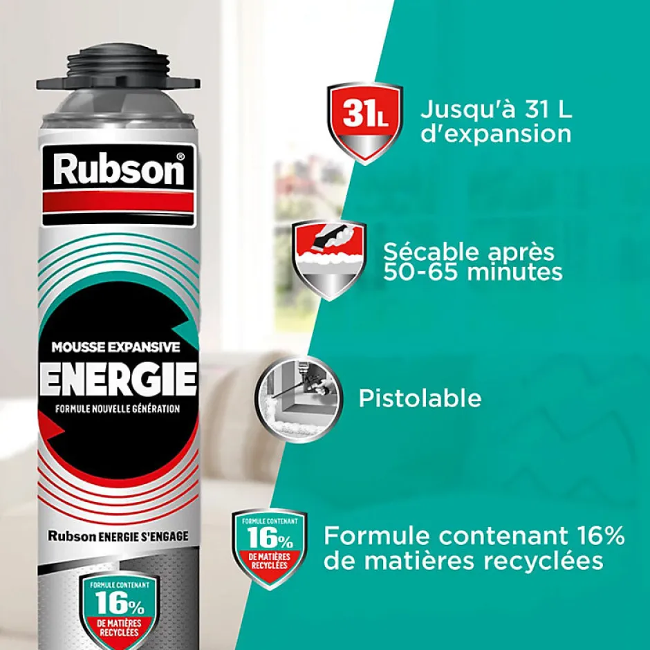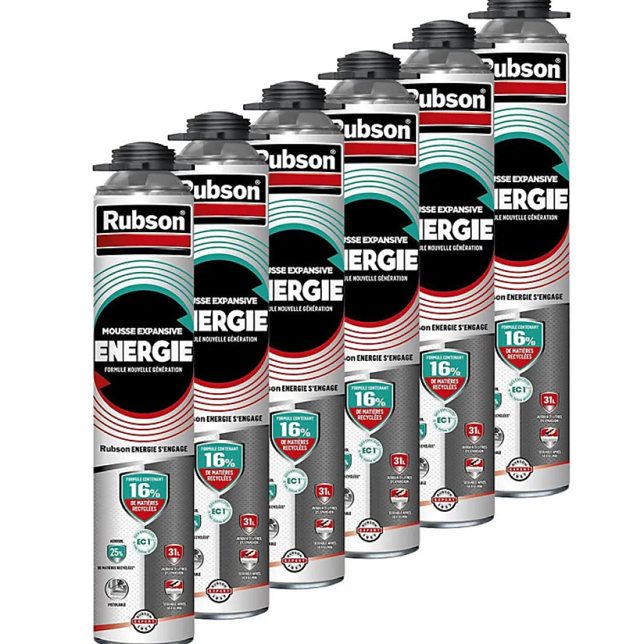 Rubson Mousse Expansive Énergie Pistolable 750 ml – Pack de 6 La mousse expansive Rubson Énergie pistolable, en pack de 6 aérosols de 750 ml , est idéale pour tous les travaux d’isolation, de calfeutrement et de remplissage. Sa formulation nouvelle génération, contenant au moins 16 % de matières recyclées , garantit un impact réduit sur l’environnement sans compromis sur la performance. Sa couleur grise résulte de l’utilisation de ces matériaux recyclés. Les avantages de la mousse expansive Rubson Énergie • Haute performance : jusqu’à 31 litres d’expansion par aérosol.• Séchage rapide : mousse sécable après seulement 50–65 minutes.• Faibles émissions : certification EC1 Plus GEV-Emicode , très faible émission de COV.• Excellente adhérence : compatible bois, béton, pierre, métal, PVC, etc.• Formule : ingrédients partiellement recyclés + aérosol composé de plastique recyclé.• Application précise : utilisation obligatoire avec pistolet pour un dosage optimal. Mode d’emploi 1. Préparation des supports Les surfaces doivent être propres, saines, stables et exemptes de poussière ou de graisse. Elles peuvent être humides mais ne doivent pas être givrées ou glacées. Protégez les zones environnantes avec une bâche. 2. Conditions d’application • Température d’application : -5°C à +35°C .• Température idéale de l’aérosol : +5°C à +30°C . 3. Agitation de l’aérosol Secouez vigoureusement l’aérosol environ 20 fois avant utilisation. 4. Application de la mousse Fixez solidement le pistolet sur la valve et utilisez l’aérosol tête en bas</strong