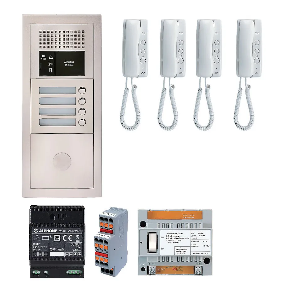 Pack interphone audio 4 BP avec 4 postes GT1D programmés – AIP/GTBA4E – AIPHONELe Pack audio 4 BP (AIP/GTBA4E) d’AIPHONE gère l’accès à un immeuble. Inclus : platine 4 boutons, 4 postes audio GT1D, centrale bus GTBC, distributeur GFC, alimentation PS2420DM.Platine audio 4 boutons d’appel à encastrerLa Platine audio à l’entrée du bâtiment a 4 boutons d’appel pour communiquer avec les occupants. Les porte-étiquettes facilitent l’identification. Micro HP GTDBV intégré pour un son de qualité. Façade pré-percée pour lecteur VIGIK, avec obturateur inclus. Design encastré discret.Quatre postes audio combiné GT1D programmésLe pack inclut 4 postes audio GT1D pour une communication bidirectionnelle confidentielle. Commandes pour déverrouillage et éclairage. Boucle magnétique pour accessibilité. Personnalisation de la sonnerie pour une expérience sur mesure.Centrale bus audio GTBCLa centrale GTBC assure la communication entre la platine et les postes audio. Elle offre un voyant vert pour vérification rapide de l’état du système. Un interrupteur permet de le mettre hors service si nécessaire. Adaptée aux copropriétés et immeubles, elle supporte jusqu’à 48 postes audio avec un câblage à deux fils non polarisés.Distributeur de bus GFCLe distributeur GFC répartit les signaux audio de la platine vers les postes intérieurs. Il offre 2 entrées et 2 x 5 sorties pour une grande flexibilité. Son installation est facile grâce à sa fixation sur un rail DIN 1 module. Compatible avec votre système existant.Alimentation PS2420DML’alimentation PS2420DM d’AIPHONE fournit une tension stable de 24 V CC à tous les composants du système. Sa technologie de découpage garantit une conversion d’énergie efficace. Compacte (93x69x66 mm), elle s’installe facilement par vis ou sur rail DIN, prenant l’espace de 4 modules.Livré avec :1 platine audio 4 boutons d’appel à encastrer4 postes audio combiné avec boucle magnétique programmés GT1D1 centrale bus audio GTBC1 distributeur de bus GFC1 alimentation PS24
