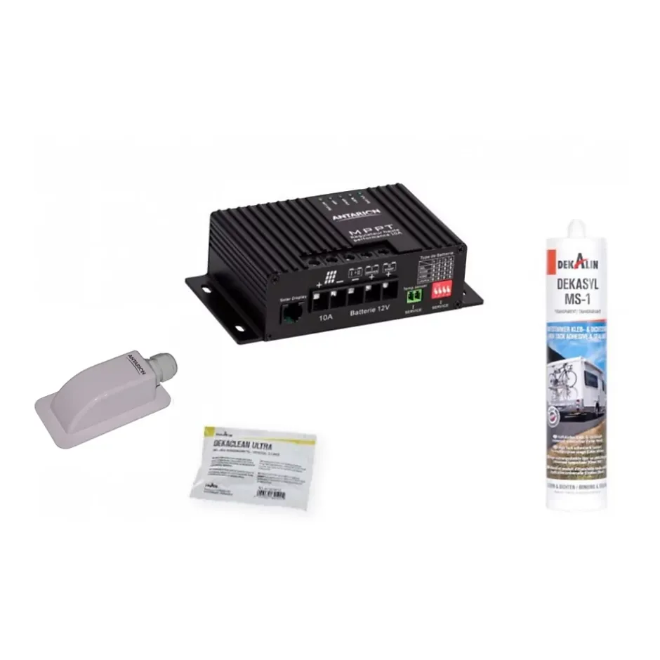 Ce pack comprend :1x Panneau solaire 160W monocristallin camping car1x Kit de panneau solaire avec régulateur de charge MPPT 160W 10APanneau solaire monocristallin 160W :Panneau livré seulPattes de fixation en aluminium anodisé striées pour améliorer l’adhérence du panneau lors du collage sur le toitBoitier de connexion étanche pour un haut niveau de sécuritéDiodes de dérivation haute performance pour minimiser les chutes de puissance en cas de faible ensoleillementProtection en verre trempé spécialement conçu pour résister aux intempériesMontage en série ou en parallèle possible et illimitéDimensions : 136.8 x 58.5 x 6cmPoids : 9.4kgLe kit de pose en blister contient :Le régulateur solaire MPPT10Un passe-toit étancheUne cartouche Dekasyl MS1Une lingette DekacleanCaractéristiques du régulateur :Le régulateur MPPT 10A (Maximum Power Point Tracking) Antarion ajuste en permanence la tension et l’intensité de charge pour obtenir le meilleur rendement solaire possibleTension de charge paramétrable en fonction du type de batterie.Convient pour toutes batteries acides, gel, AGM ou lithium en 12V ou 24VDeuxième sortie batterie pour pouvoir charger la batterie moteurPuissance solaire de 160W maxDimensions : 14,7 x 7,9 x 4 cmPoids : 0,34 kg