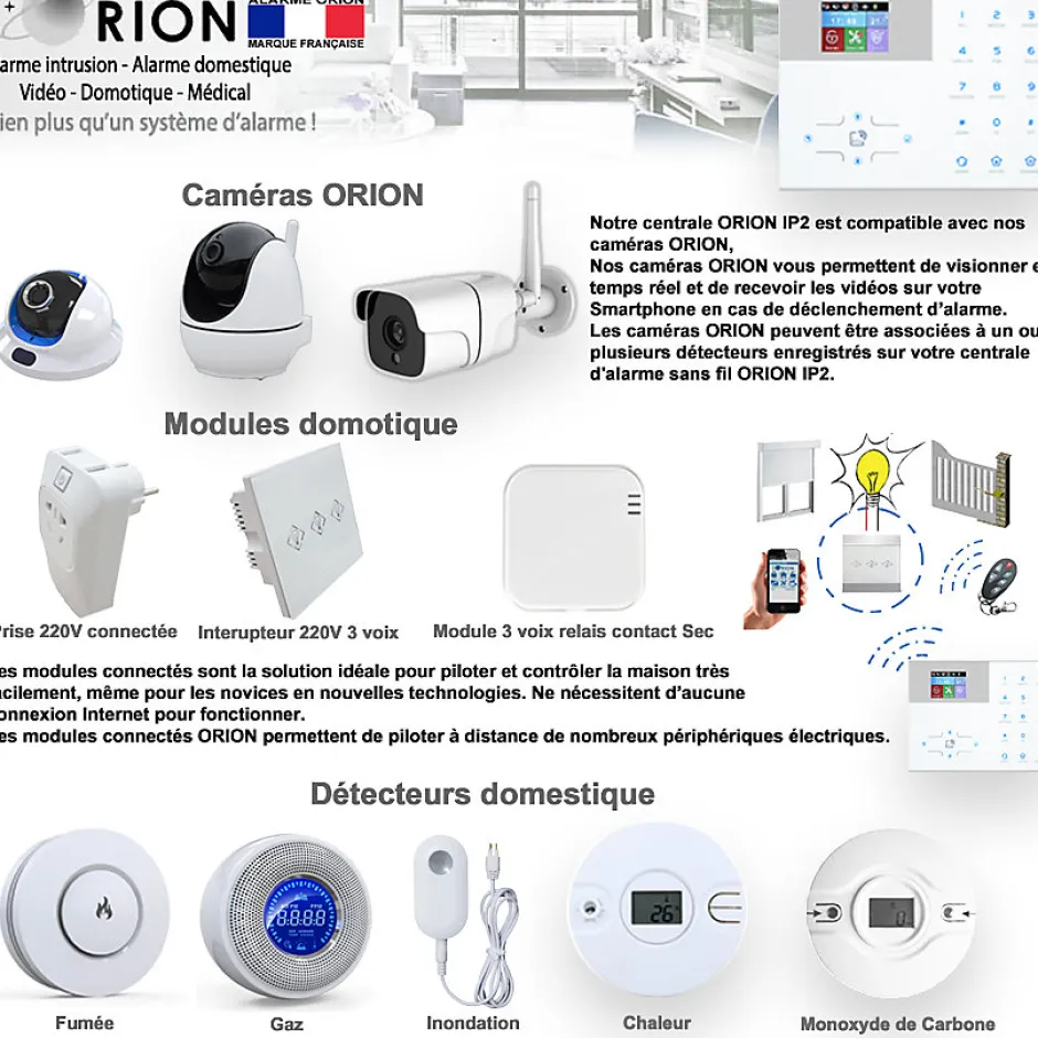 Livraison le lendemain pour toutes commandes effectuées avant 13H.INCLUS DANS CE PACK: – 1 Centrale d’alarme sans fil ORION IP2 GSM 4G (Compatible 2G,3G,4G,LTE).- 1 Sirène sans fil extérieure solaire.- 4 Télécommandes 6 fonctions.- 6 Mini détecteurs d’ouverture sans fil PREMIUM (porte ou fenêtre).- 4 Mini détecteurs de mouvement PREMIUM (immunité 10kg).- 2 Badges RFID.- 1 Alimentation 220/12v.- Piles, batteries et fixations inclus.Autonomie des piles des détecteurs : + 5 ansCentrale garantie 5 ansAccessoires garantis 2 ansA la pointe de la technologie, la centrale d’alarme maison sans fil ORION IP2 connectée est un système anti-intrusion innovant basé sur l’IP qui avertit en cas de cambriolage, d’incendie ou d’inondation.La centrale ORION IP2 peut être associée avec toute une gamme d’accessoires sans fil ORION, comme des caméras extérieures ou intérieures, des détecteurs de fumée de Gaz de CO2 ou d’inondation, des modules domotique et prises connectées, des boutons et télécommandes médical/panic…Centrale avec double transmetteur (IP + GSM)- IP: 100 % compatible avec tous les routeurs, Box Internet, modem..- GSM: 100% compatible avec tous les opérateurs et réseaux GSM (2G, 3G, 4G, LTE, GPRS*).*GPRS permet un accès internet à la centrale via la carte SIM, la consommation moyenne en data de la centrale est de 30MO par mois.Il permettra à votre centrale de rester connectée à Internet sans utiliser la connexion à votre BOX ou en cas de coupure de votre BOX Internet.Centrale d’alarme ORION IP 2 avec fonction vidéo: Notre centrale d’alarme ORION IP2 est compatible avec nos caméras ORION. Nos caméras ORION vous permettent un visionnage à distance en temps réel et de recevoir les vidéos sur votre Smartphone en cas d’alarme, nos caméras disposent