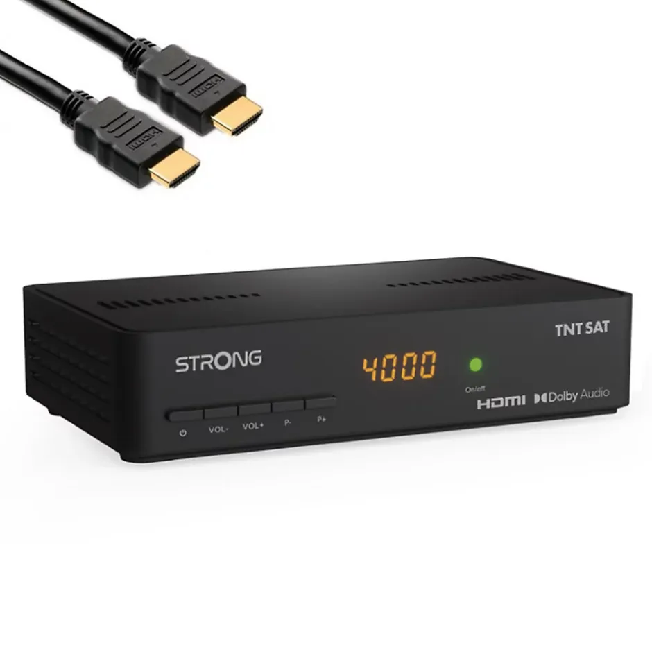 Ce pack comprend:- 1x STRONG SRT 7408 Décodeur Satellite ASTRA HD + Carte TNTSAT Valable 4 ans- 1x HDSAT Câble HDMI Longueur 2m High Speed haute vitesse Full HD 4K Cordon TVDescription du décodeur:Profitez des chaines HDProfitez des chaînes HD de la TNT disponibles par satellite avec TNTSAT ainsi que des chaînes de TV et radio en clair d’ASTRA 19.2°E. Le port USB du SRT 7408 vous permet d’enregistrer des programmes TV.Connectez-le à votre TV via HDMI et profitez de la qualité HD. Le SRT 7408 offre des fonctionnalités telles que l’EPG, listes de favoris, télétexte, sous-titres et alimentation 12 V pour utilisation nomade (caravaning, bateau, …).Vue d’ensemble produitTerminal MPEG-4 HD pour recevoir les programmes TNT diffusés en numérique haute définition via satellite, en plus de ceux diffusés en simple définitionLecteur de carte Viaccess TNTSATInstallation rapide des chaînes de la TNT disponibles par satellite avec TNTSATPermet de recevoir la majorité des chaînes numériques disponibles en clair sur le satellite ASTRA (19,2 ° EST) et les autres satellites réceptionnésUSB : Enregistrement, Mises à jour logicielListes de préférences pour les programmes radio et TVExcellente qualité vidéo et audioGuide électronique des programmes (EPG) pour obtenir des informations sur le programme en cours/ suivant et sur les émissions à l’écran pendant les 7 prochains joursCapacité mémoire 4000 chaines Caractéristiques- Rappel de la dernière chaîne visionnée au démarrage- Télétexte, support pistes audio et sous-titrage DVB entièrement multilingue- Verrouillage parental pour les fonctions du menu, contrôle parental pour le contenu- Compatible 12 V, idéal pour le caravaning, bateau, … (uniquement fourni av