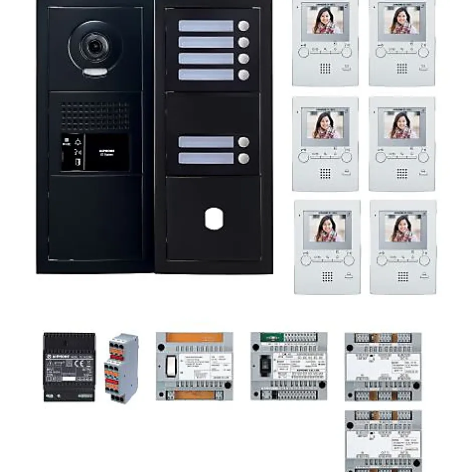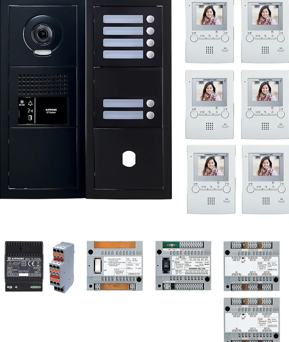 Pack clé en main pour logements collectifs, avec platine façade noire satinée et 6 boutons programmables. Solution préprogrammée pour une installation rapide et fiable, équipée de moniteurs couleurs mains libres avec ouverture de porte à distance, compatible avec système vidéo AIPHONE GT. Dimensions compactes et résistance aux intempéries (IP65).