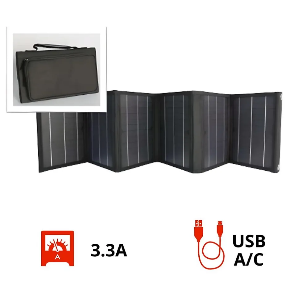 Caractéristiques : Type de produit : Panneau solaire, Marque : Protec, Gamme : SolarTec 60, Couleur : Noir, Puissance nominale : 60W ± 5%, Courant de court-circuit : 3.7A ± 5%, Tension en circuit ouvert : 21.6 ± 5%, Courant au point de puissance max : 3.3A ± 5%, Tension au point de puissance max : 18V ± 5%, Rendement : 21.8%, Sortie 18V / 3.3A, Câble de recharge 1.5m, Taille (déplié) : 127 x 35,2 x 2,5 cm, Poids : 2.2kg, Structure en 5 couches : transmission élevée et forte résistance aux intempéries, Temps de charge de la station Advance 650 : 11h max, Pliant 6 pans monocristallins, Inclus : 1 port USB-A 15W / 1 port USB-C 18W / 1 câble DC 7909, Sacoche de transport inclue, Norme : CE, Granatie : 2 ans.
