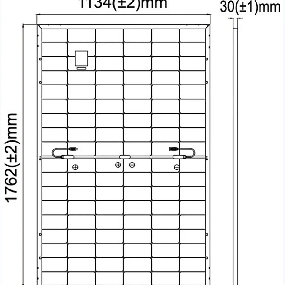Panneau solaire Série Mono cellules TOPCon Bifacial Bi-Verre 450W Dimensions : 1762 x 1134 x 30mm* Alimentation des gros éléctroménagers* Alimentation des outils de puissance* Alimentation des systèmes de chauffage et de climatisation* Alimentation de systèles de pompage d’eau plus grandes pour l’irrigation agricole* Alimentation des systèmes d’éclairage extensifs* Alimentation des système de divertissement complets* Chargement de véhicules électriquesCes usages favorisent l’autoconsommation d’énergie solaire, ce qui peut réduire les coûts énergétiques et contribuer à une empreinte carbone plus faible »108 cellules monocristallines TOPCon BifacialSélection des meilleures cellules afin d’optimiser le rendement au m2Module haute performance ayant une tolérance de 0 – 5%Verre trempé : le traitement anti-reflet et la haute transparence augmentent la production ainsi que la puissance du moduleBoîte de jonction IP68, 3 diode by-passCadre en aluminium anodisé et renforcé avec une double paroiFabriqué pour faire face à des conditions météos difficiles