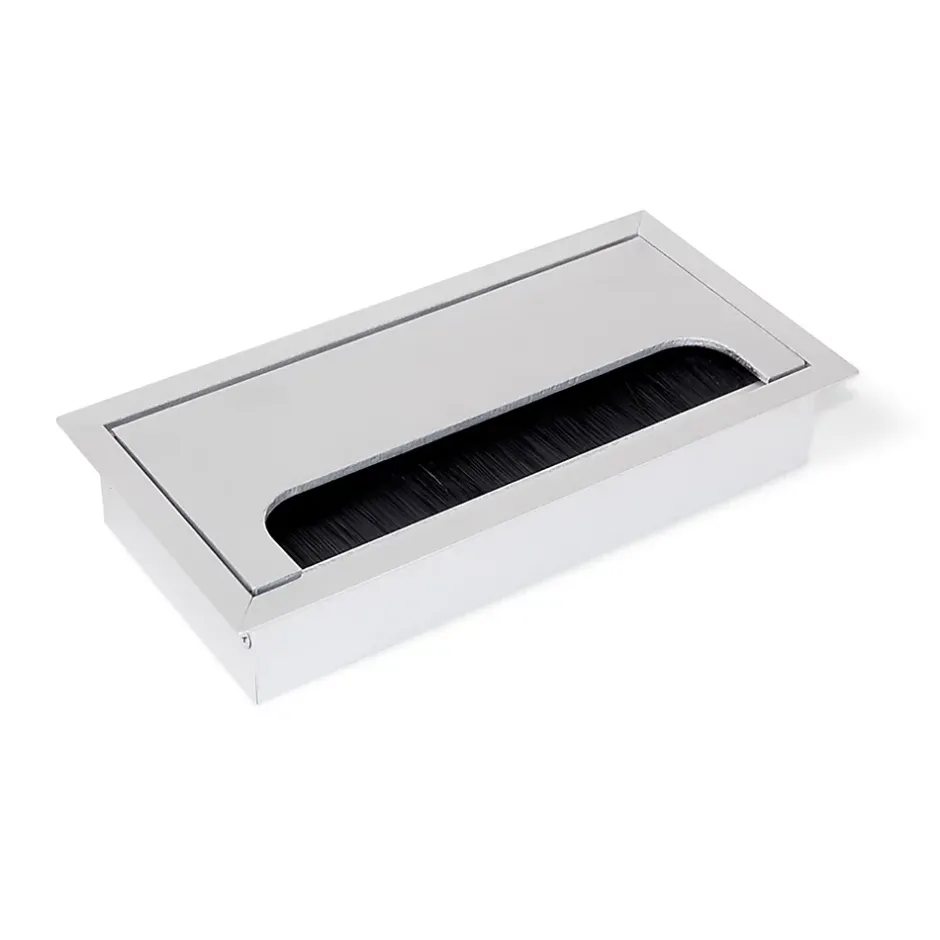 Passe-câbles rectangulaire à insérer dans la surface des bureaux, tables ou meubles de maison pour cacher les câbles des appareils électroniques.Il permet de faire passer des câbles de toute épaisseur et de cacher leurs connexions. Pour y accéder, il dispose d’un couvercle abattant et de brins en plastique noir.Pour son installation, il nécessite un usinage préalable de 147 x 68 mm. La fixation s’effectue par pression.Peut être monté sur des surfaces très épaisses.Fabriqué en aluminium anodisé mat. VOIR LES MESURES DU PRODUIT DANS LES IMAGES. Passe-câbles rectangulaire pour encastrer sur les bureaux ou les tables de travail fabriqué en aluminium. Il est compatible avec les câbles de toutes dimensions et dissimule leurs connexions facilement grâce à son couvercle rabattable.