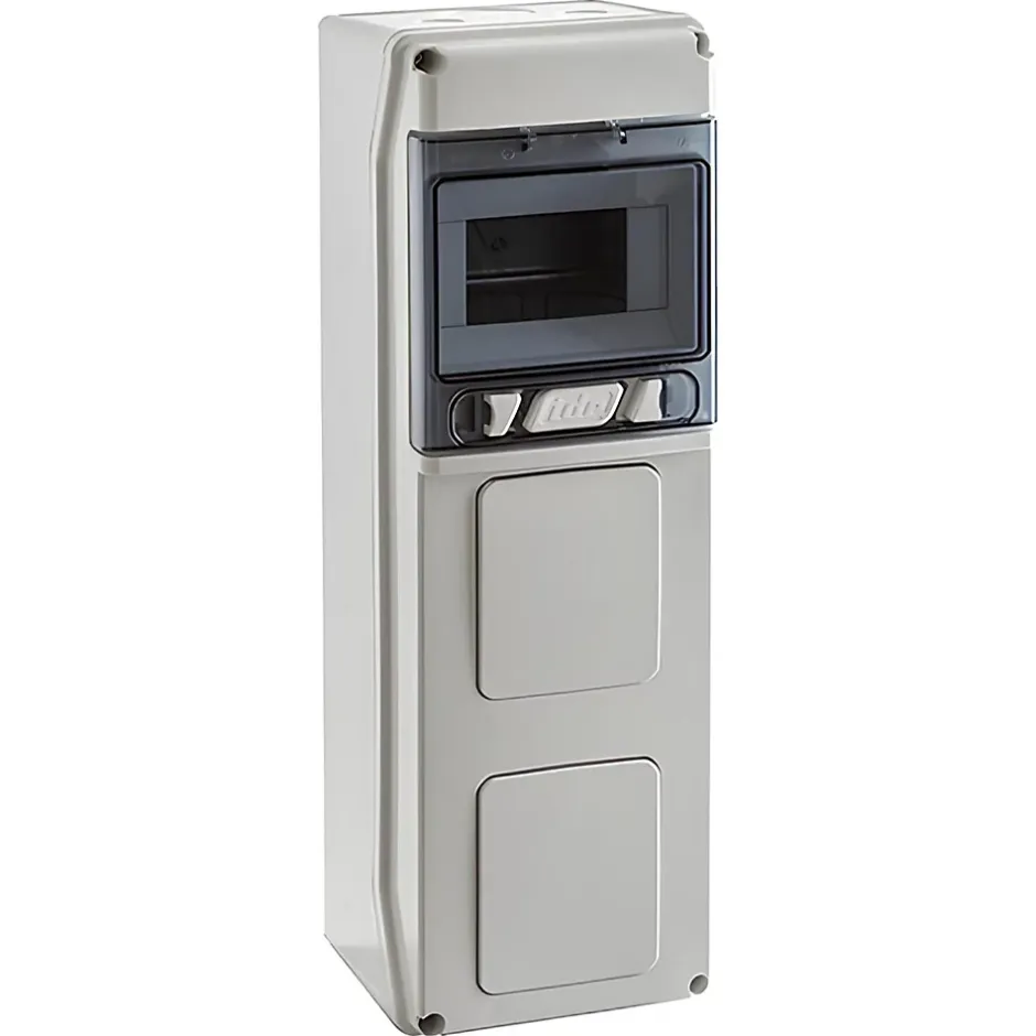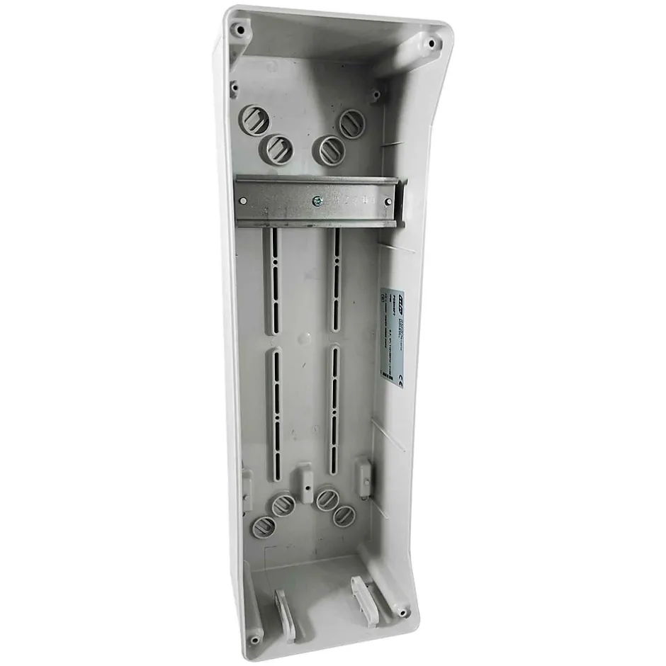 Coffret modulaire étanche 6 modules – Porte transparenteLe coffret PCSN6PT fabriqué par IDE dispose d’une étanchéité IP65 ainsi qu’un certificat de résistance aux impacts externes IK08.De dimensions HxLxP 436x142x137mm, ce coffret modulaire en ABS de la gamme Star peut intégrer 6 modules répartis sur 1 rangée de 6 modules.L’ensemble de l’appareillage est protégé par 1 porte vitrée en polycarbonate verrouillée par 1 serrure.Une serrure à clé, référence 92150, est disponible en option.le coffret est prédécoupé sur sa face avant pour pouvoir intégrer 2 prises.Rail DIN fourni et monté.Le bornier de terre n’est pas fourni avec le coffret. Vous pouvez commander la référence IDE officiellement compatible IDE22007 ou alors commander un bornier de terre à clipser sur rail DIN Legrand 004832 (solution plus économique).Les faces supérieures et inférieures du coffret sont prédécoupées pour faciliter le passage de câbles.Attention, ce coffret n’est compatible qu’avec des prises IDE.