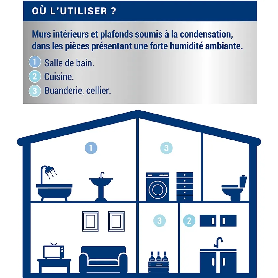Résiste à l’humidité ambiante, ne s’écaille pas et empêche le développement de moisissures. Lessivable et microporeuse.Empêche la condensation des vapeurs d’eau chaudes sur murs et plafonds, en réduisant l’effet du choc thermique