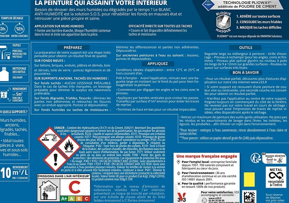 Idéal pour rénover les murs humides ou dégradés par le temps. Le Blanc Anti-humidité est la solution S.O.S pour assainir les murs, réhabiliter les fonds en mauvais état et retrouver une pièce propre et saine.