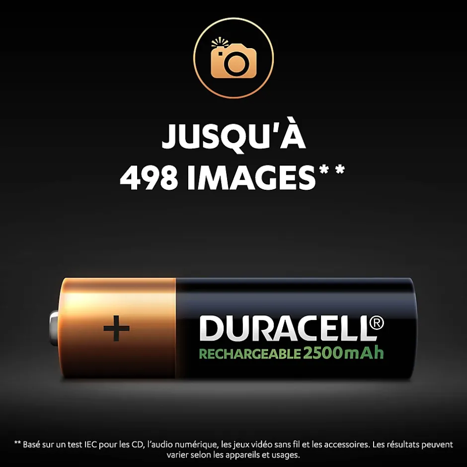 - Les piles rechargeables Duracell AA 2500mAh sont pré-chargées, prêtes à l’emploi.